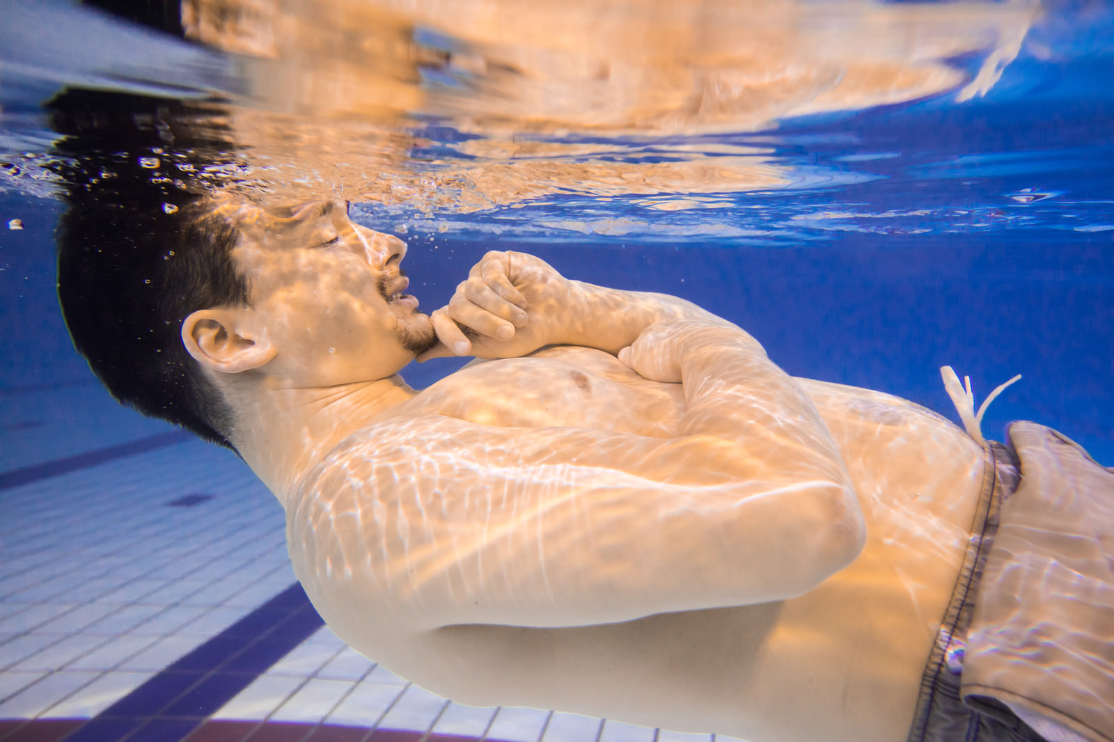 A man who won't come out of the pool because he's self-conscious about his protruding belly