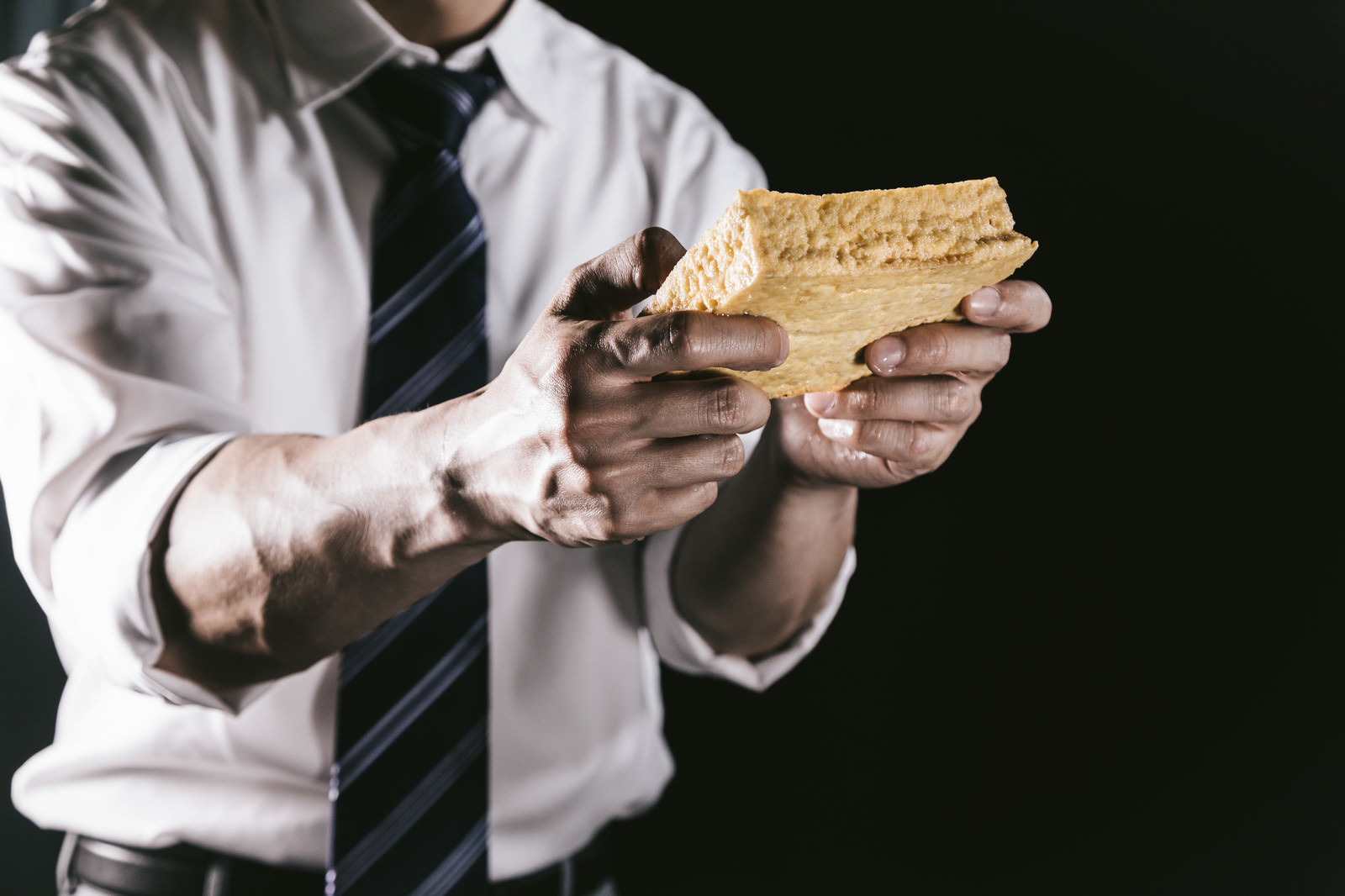 スーツを着た男性が厚揚げを持っている写真素材です。携帯ゲーム機と見間違えるほどの形をした厚揚げを、スーツ姿のビジネスマンが両手で大切に掲げています。油揚げとは異なる厚揚げの形状が、ゲーム機に酷似している点がポイントです。ネタ系コンテンツやユーモア広告などにおすすめです。