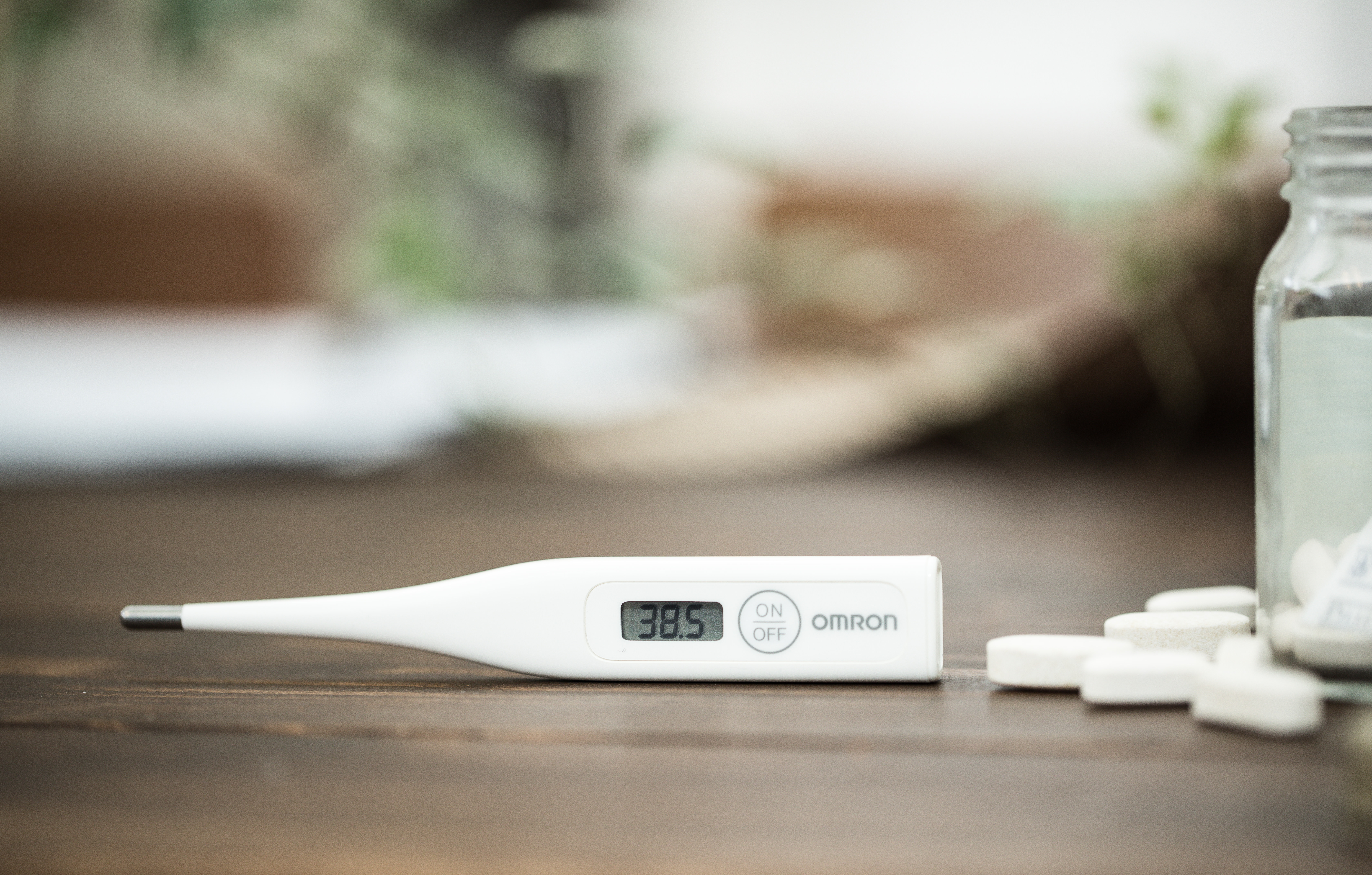 38度5分を示す体温計の写真素材です。テーブルに体温計と白い錠剤が置かれ、背後には透明な瓶がある。風邪や発熱を扱う医療・健康系コンテンツに使いやすい素材です。