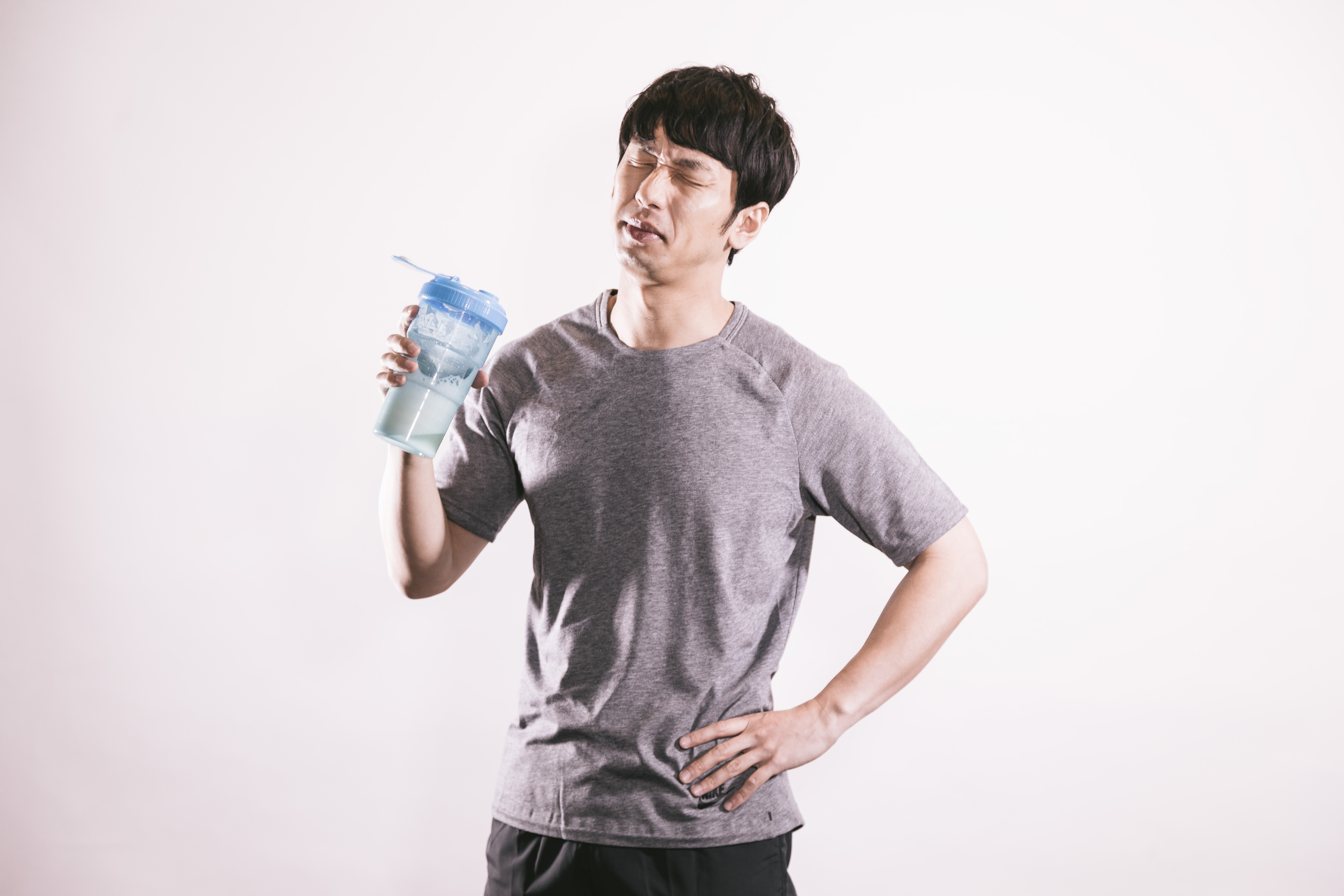 プロテインの味が合わない困った男性のトレーニング後のフリー写真素材