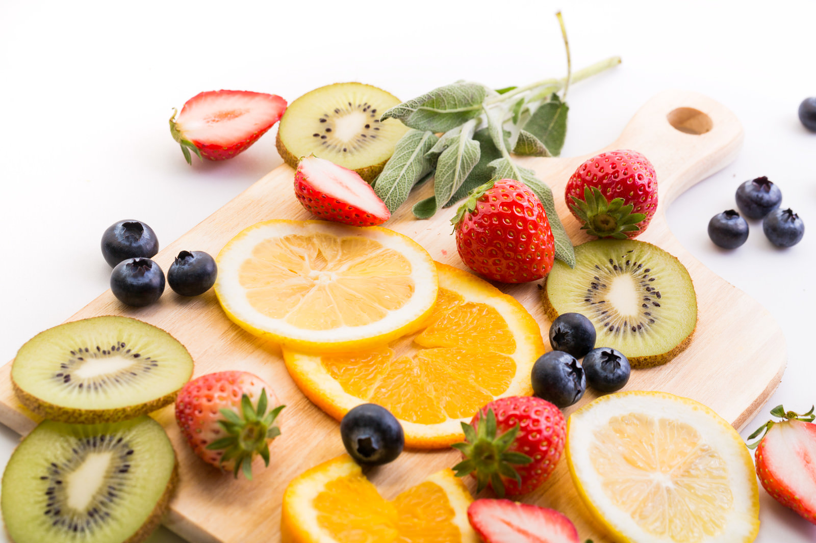 カットされたフルーツの写真素材です。いちご、レモン、キウイ、ブルーベリーなど複数の種類の果物が白い背景に鮮やかに並べられており、カラフルで見映えの良い構成。健康的なデザートや食品関連のコンテンツ制作、栄養情報の発信などにおすすめです。
