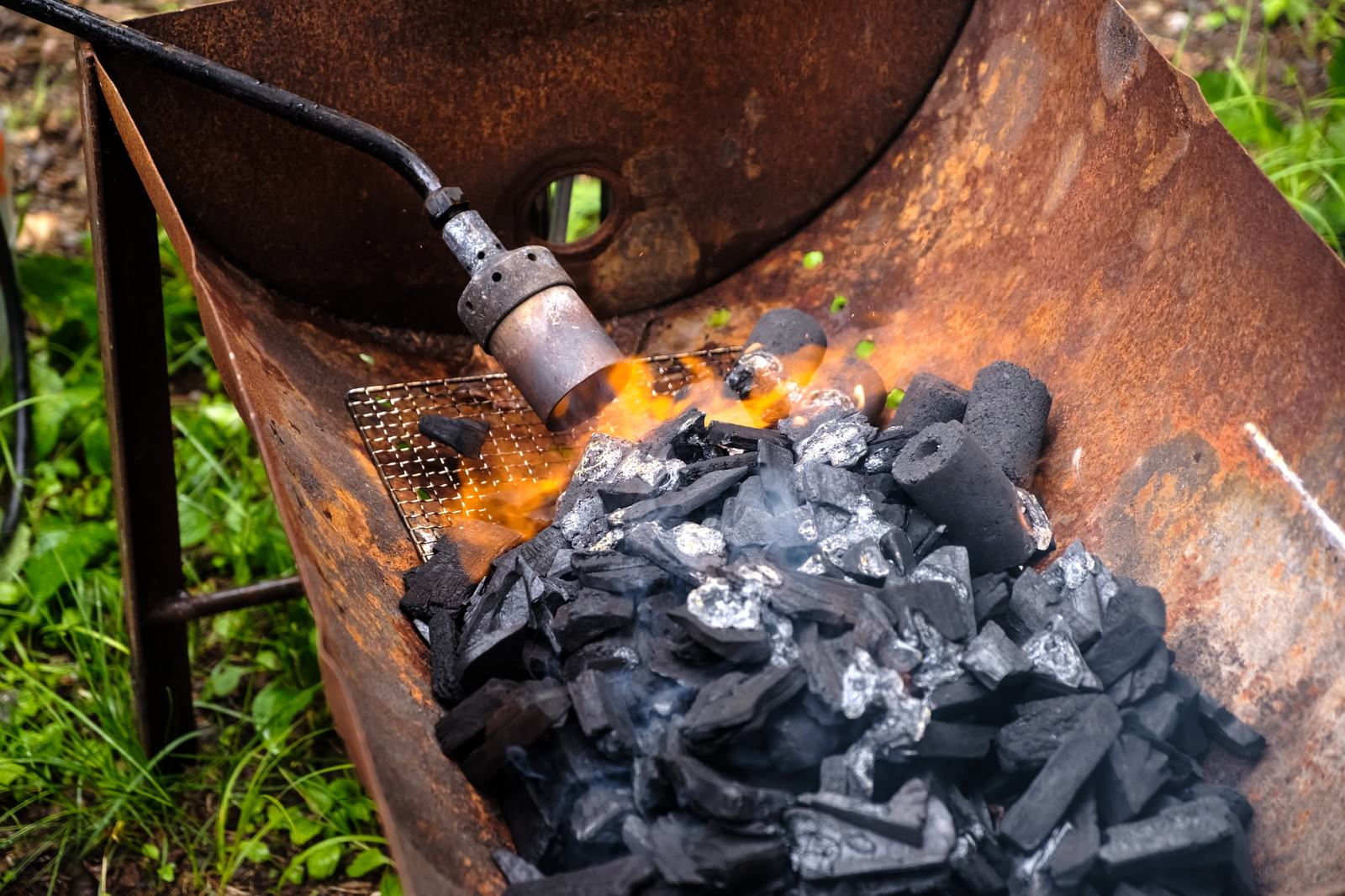 トーチバーナーで木炭に火をおこしている写真素材です。黒い木炭にオレンジ色の炎が立ち上がり、トーチバーナーの強い火力で着火している様子を表現した迫力ある1枚で、バーベキューやキャンプ、アウトドア関連のコンテンツ制作に最適です。