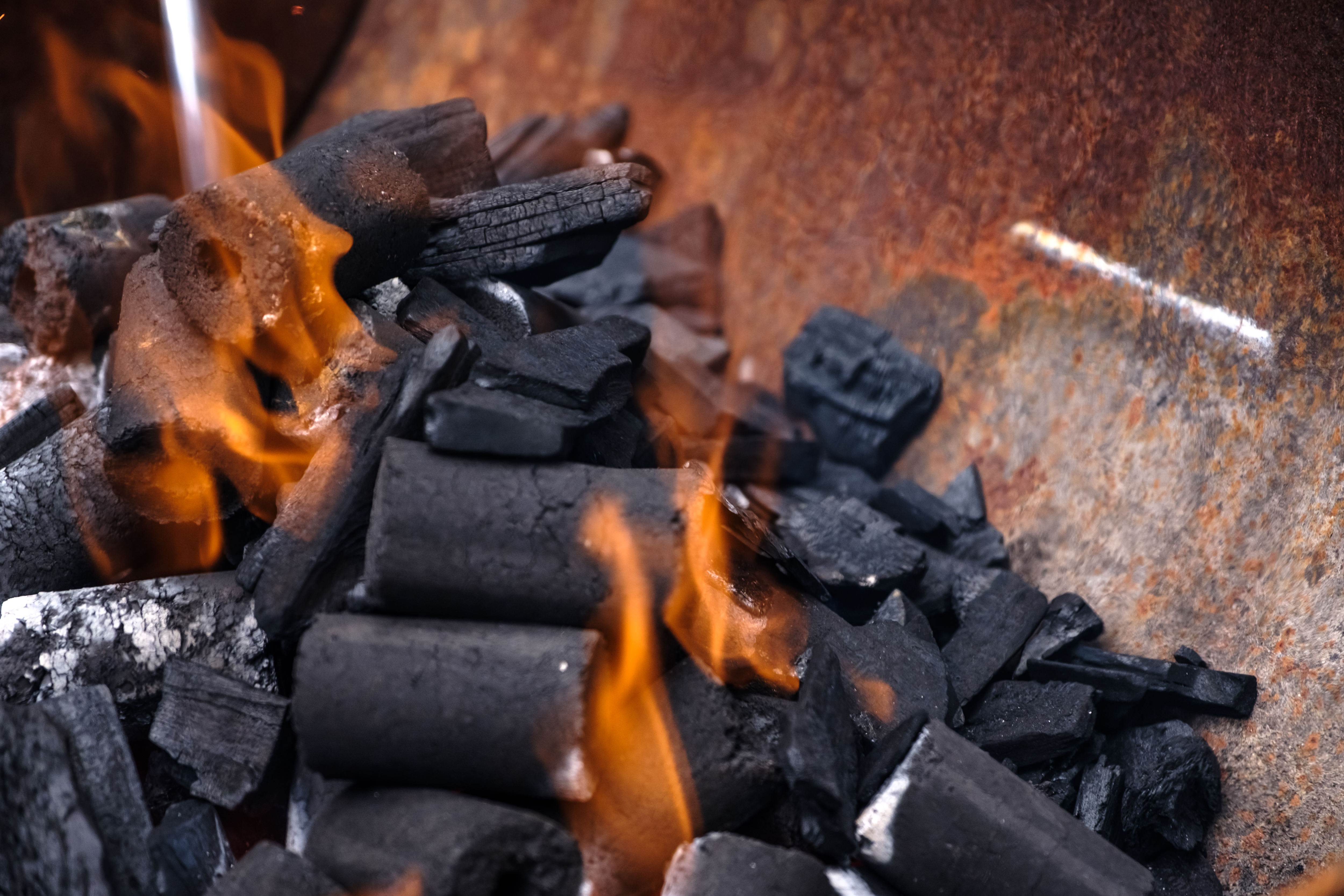 BBQの火起こしの写真素材です。木炭に炎が燃え上がり、オレンジ色の火が勢いよく立ち上がっており、熱気が伝わります。グリル調理の準備風景として、アウトドアやキャンプ関連のWebサイト、BBQ特集やグリル料理の記事などにおすすめです。