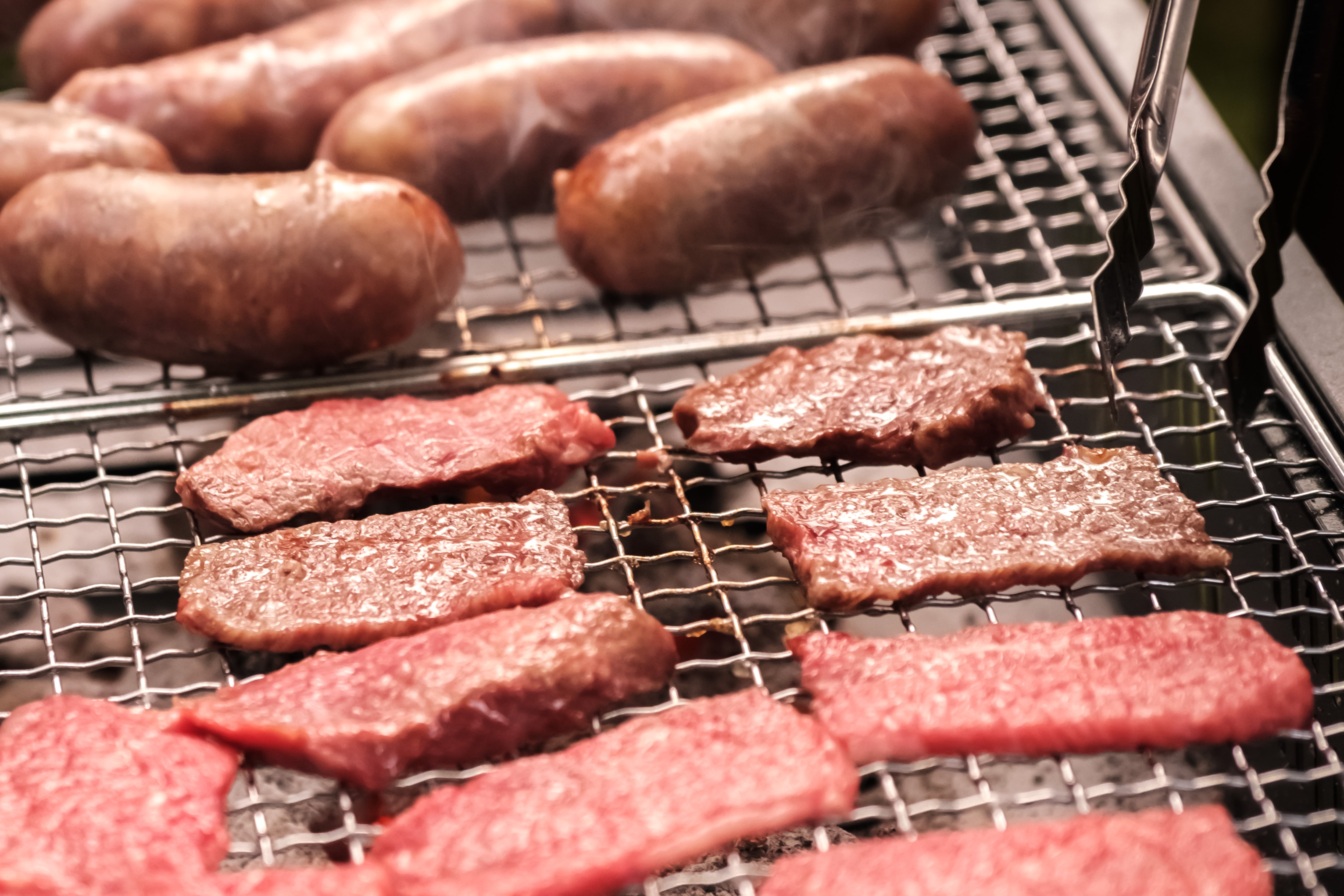 炭火の網でウィンナーとハンバーグを焼いている写真素材です。ジューシーに焼けたウィンナーと肉厚なハンバーグが炭火の上で香ばしく焼き上がり、煙が立ち上っています。アウトドア記事やキャンプブログ、BBQ・焼肉関連のWebサイト制作におすすめです。