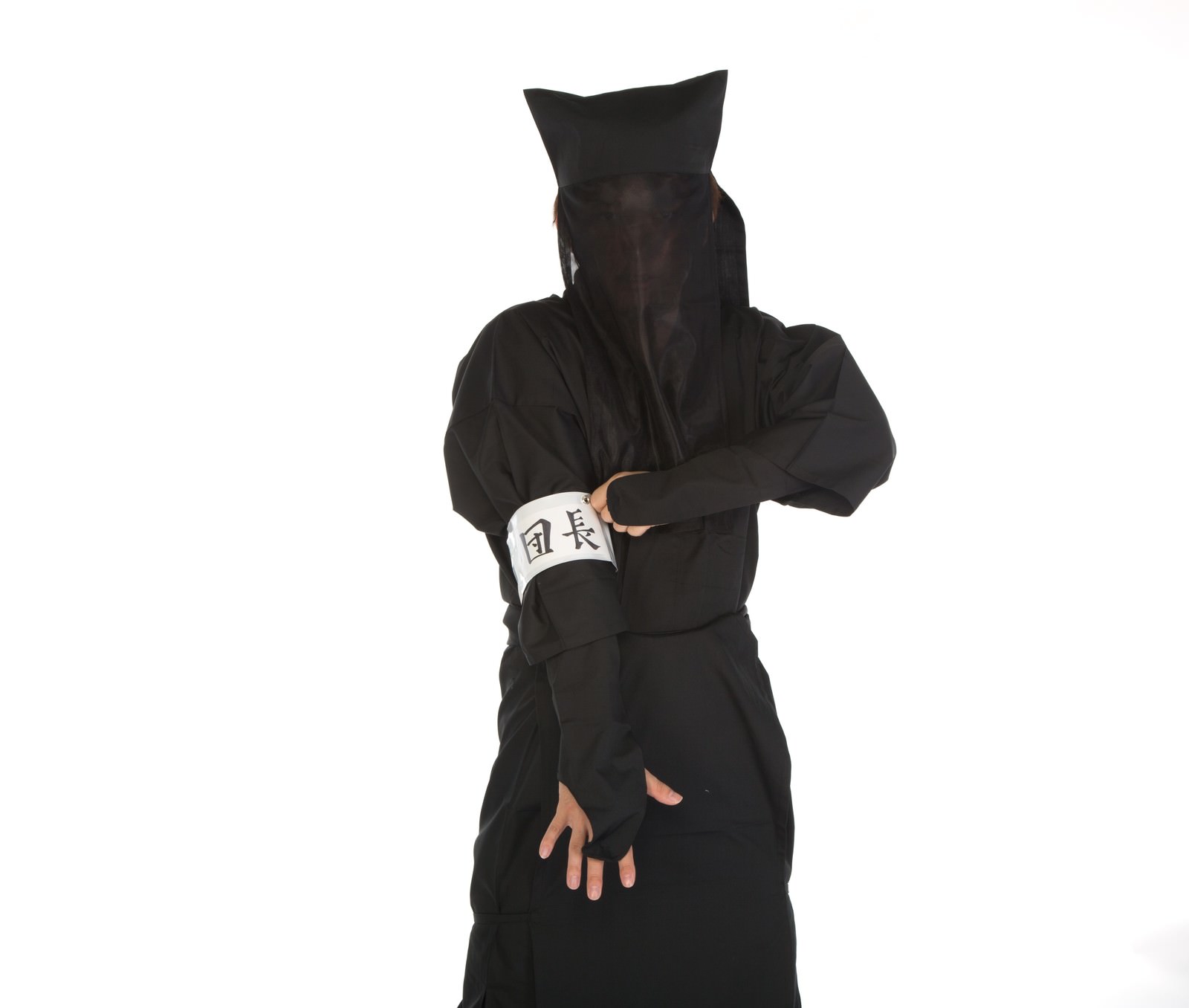 腕章をつけた黒装束の人物の写真素材です。全身を黒い衣装で覆い、腕に白い腕章を巻いた団長姿が白背景に映っており、組織のリーダーや統率者としてのイメージを表現しています。匿名性やリーダーシップを演出するWebサイトやブログ記事、企画資料などにおすすめです。