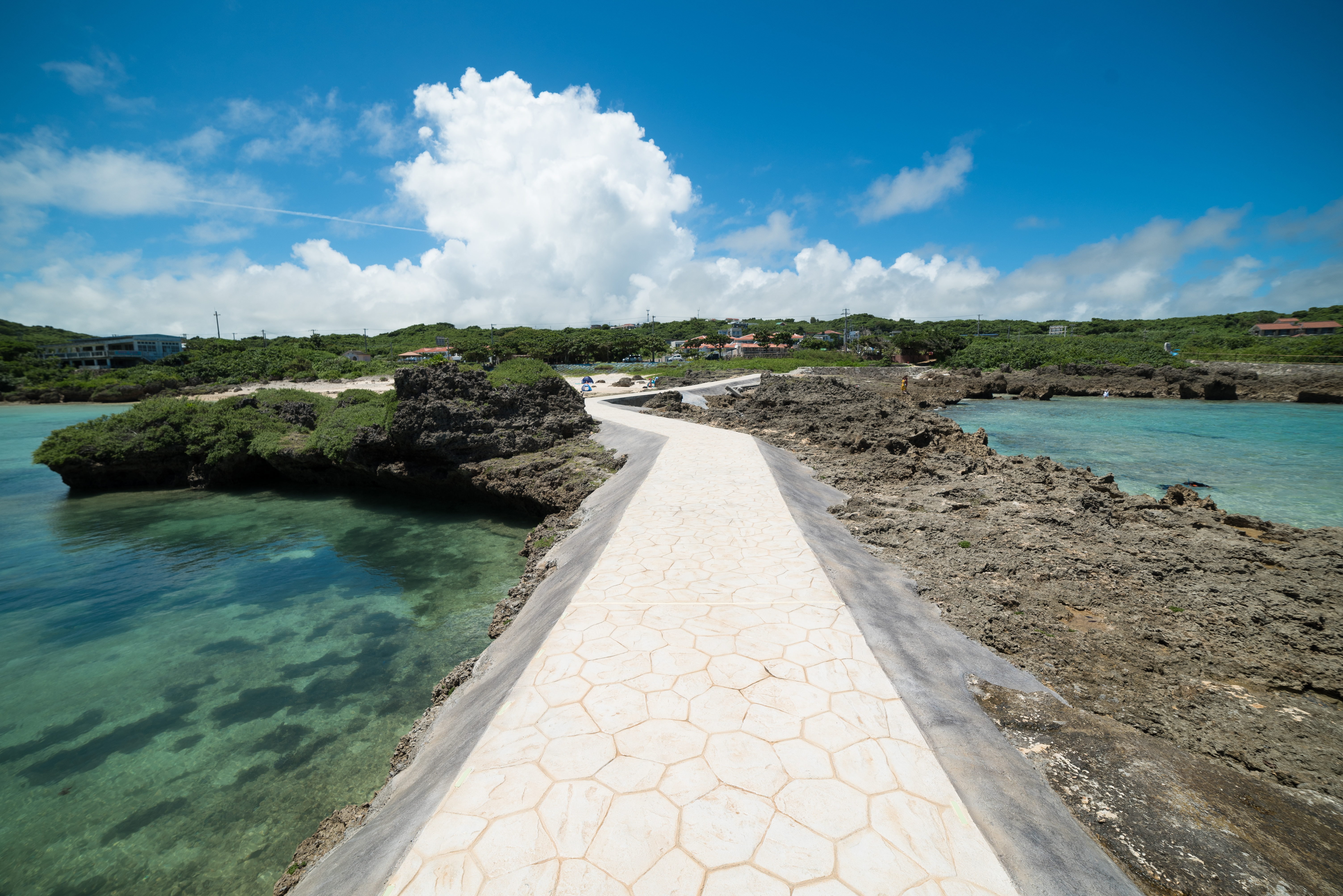 沖縄の島へ続く白い桟橋の写真素材です。エメラルドグリーンの海に白い桟橋が一直線に伸び、青空と白い雲が広がっています。旅行やリゾート関連のコンテンツ、沖縄の観光素材としておすすめです。