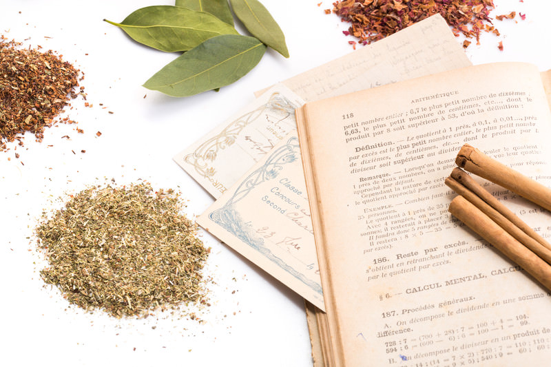 乾燥ハーブとシナモンスティック、開いた古書を白い背景に並べた写真素材です。フランス語の文章が印刷されたページが開かれ、月桂樹の葉や茶色いスパイスが周りに散らばっている。自然療法やアロマ、ハーブティー関連のコンテンツ素材におすすめです。