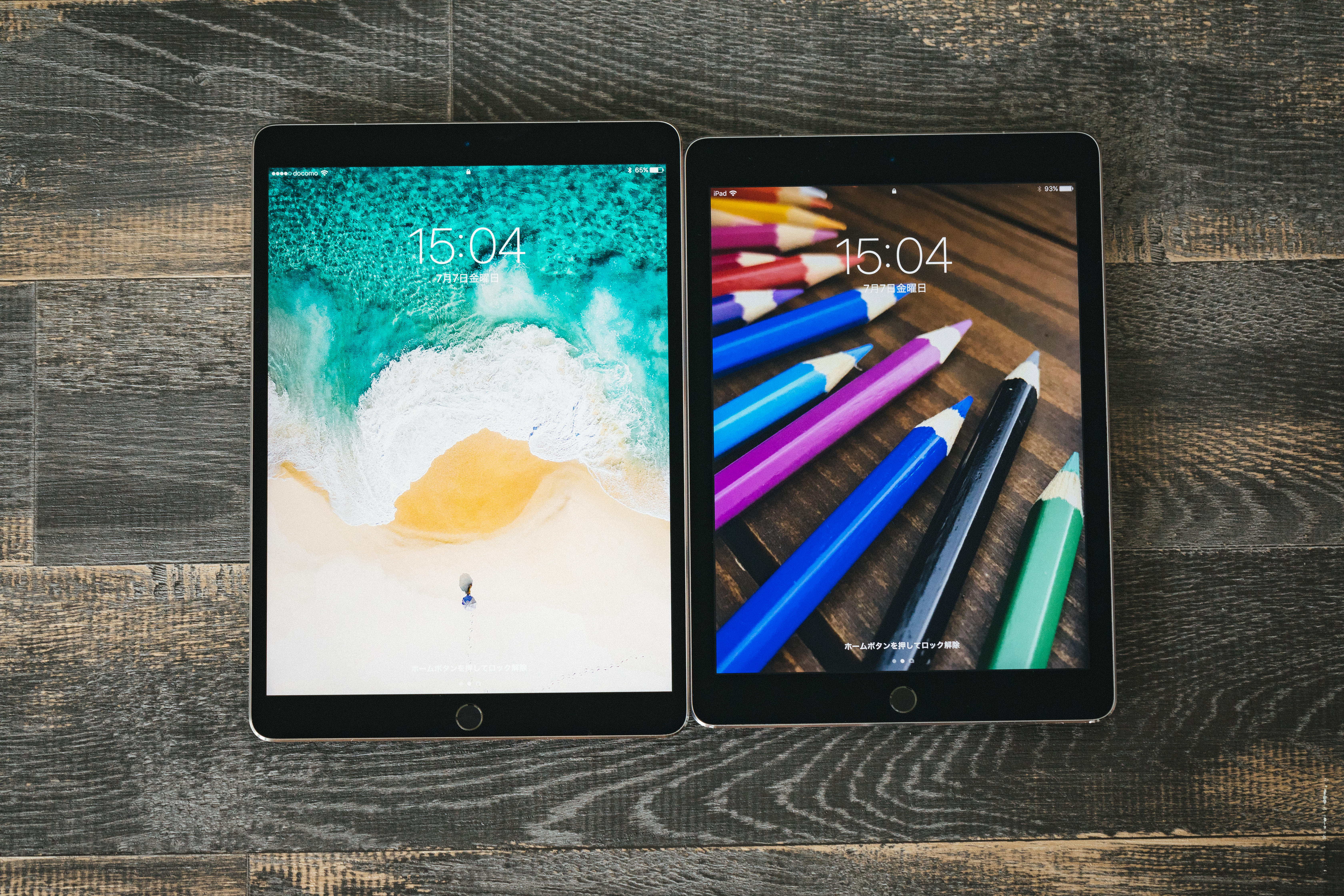 サイズの異なる2台のタブレットの写真素材です。大小2つのタブレットが木目のテーブルに並んで置かれており、それぞれ異なるコンテンツが表示されています。ガジェット紹介やデバイス比較記事、テクノロジー関連のWebサイトやブログなどにおすすめです。