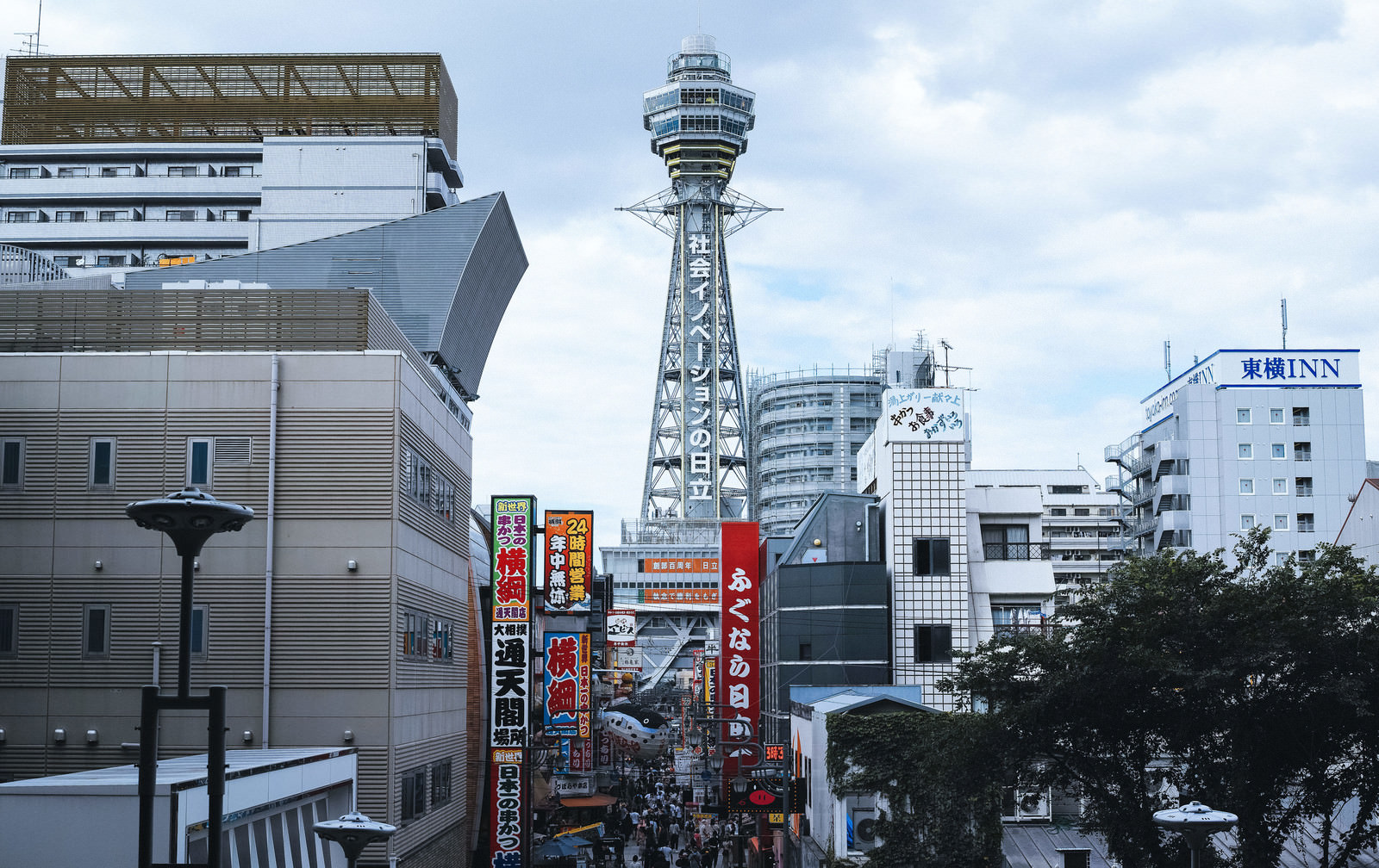 大阪新世界の通天閣と商店街の写真素材です。高層ビルに囲まれた通天閣と、軒を連ねる商店街の建物群が織りなす繁華街の風景が特徴。昼間の活気ある街並みやアーバン風景素材として、大阪関連のコンテンツ制作に最適な画像です。