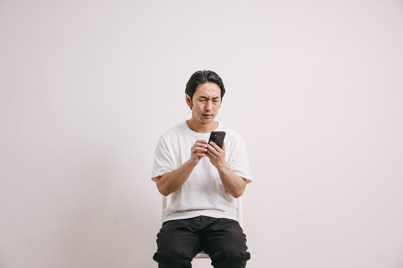 スマートフォンを見ながら怒る男性の写真素材です。白いTシャツと黒いパンツを着た男性が座り、両手でスマートフォンを持って画面を見つめ、眉間に皺を寄せイライラした表情を浮かべています。アプリやシステムのエラー表現、トラブル・ストレス関連のコンテンツ制作などにおすすめです。