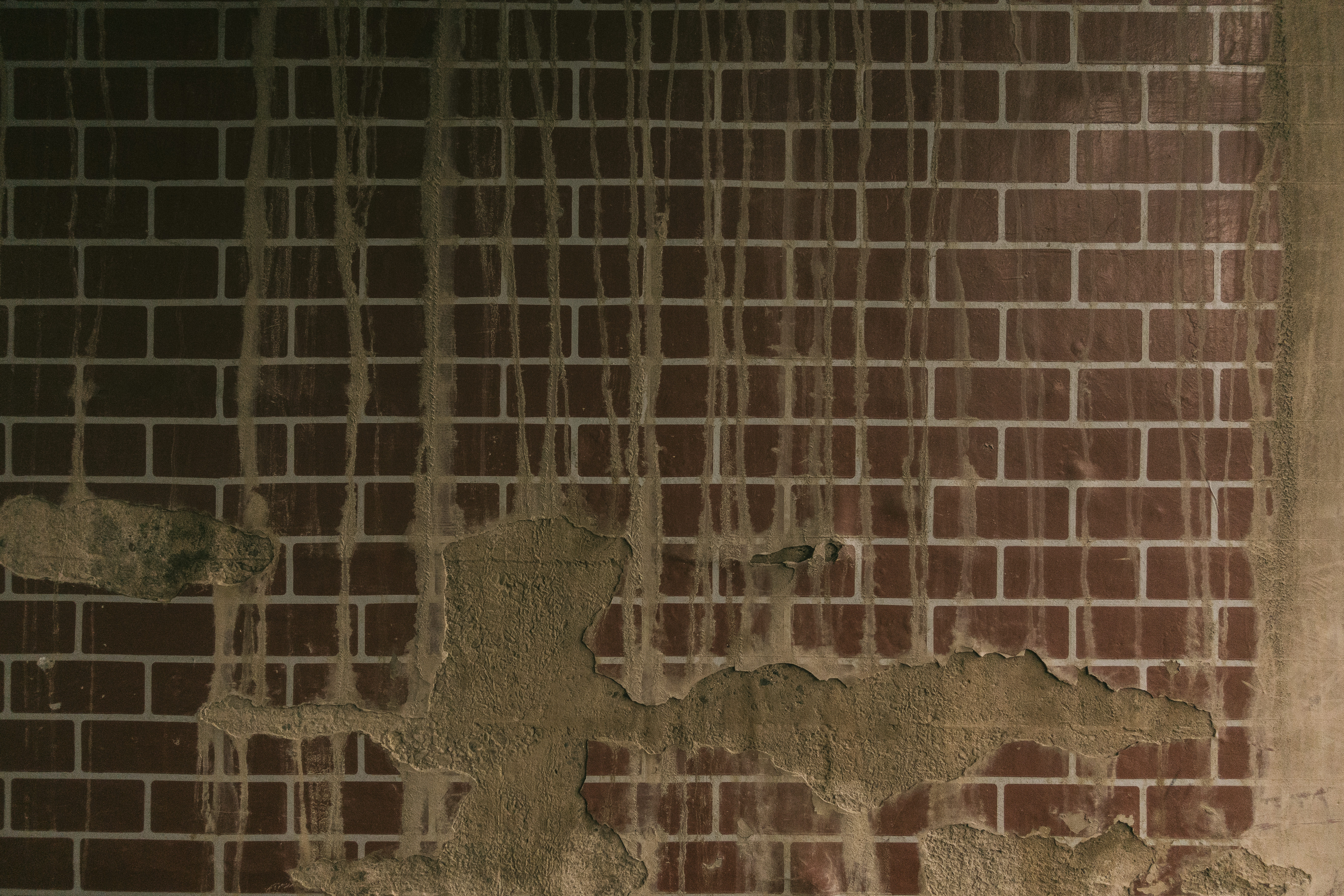 剥がれ落ちたタイルの壁の写真素材です。茶色と緑色のタイルが部分的に剥離し、下地が露出した古い壁面で、表面には汚れが付着しており、不気味で崩れた質感を表現しています。ホラーやサスペンス作品、廃墟系のデザイン制作などにおすすめです。