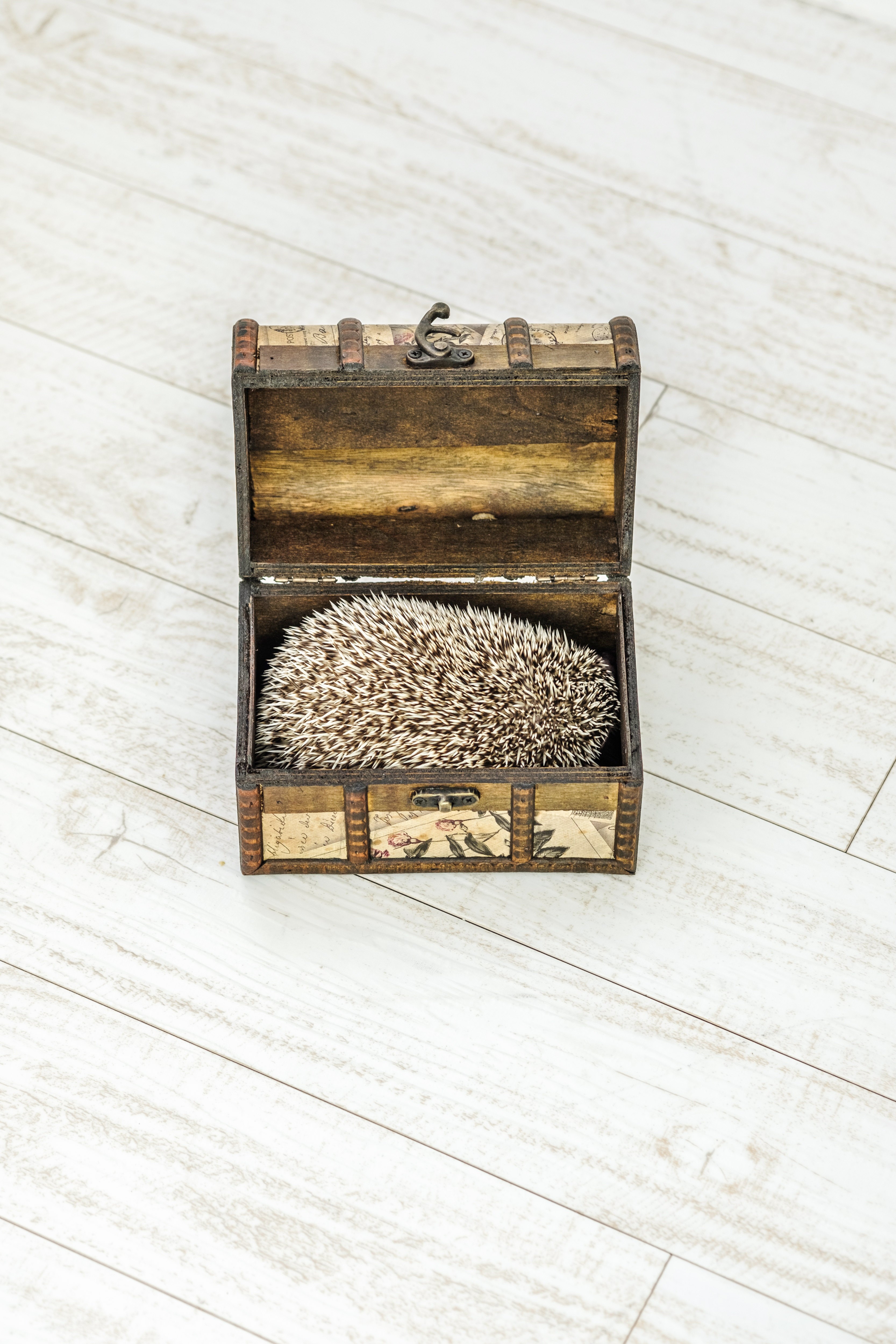 木箱に入ったハリネズミの写真素材です。白い床の上に置かれた木製の箱の中で、針を立てたハリネズミが丸く体を丸めており、RPGゲームの罠や宝箱トラップです。ゲームやRPG系のコンテンツ制作、動物関連のWebサイト、ユーモアのあるゲーム解説記事などにおすすめです。