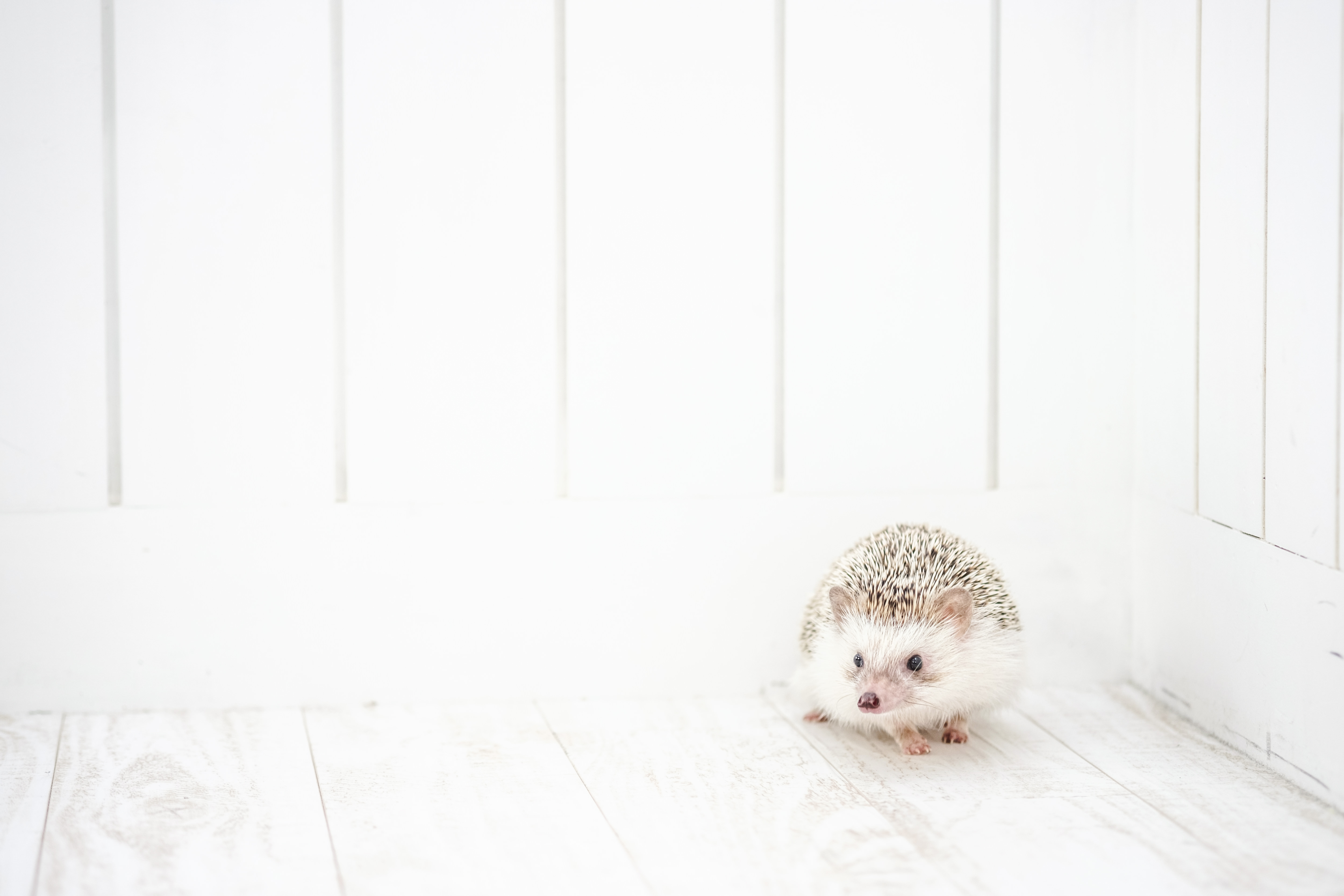 壁際で丸まっているハリネズミの写真素材です。白い壁の隅に寄り添うようにして体を丸くコンパクトに縮こまった様子が撮影されており、ハリネズミが壁の隅を好む習性が伝わる一枚となっています。ペット関連のWebサイトやブログ、動物テーマのデザイン制作などにおすすめです。