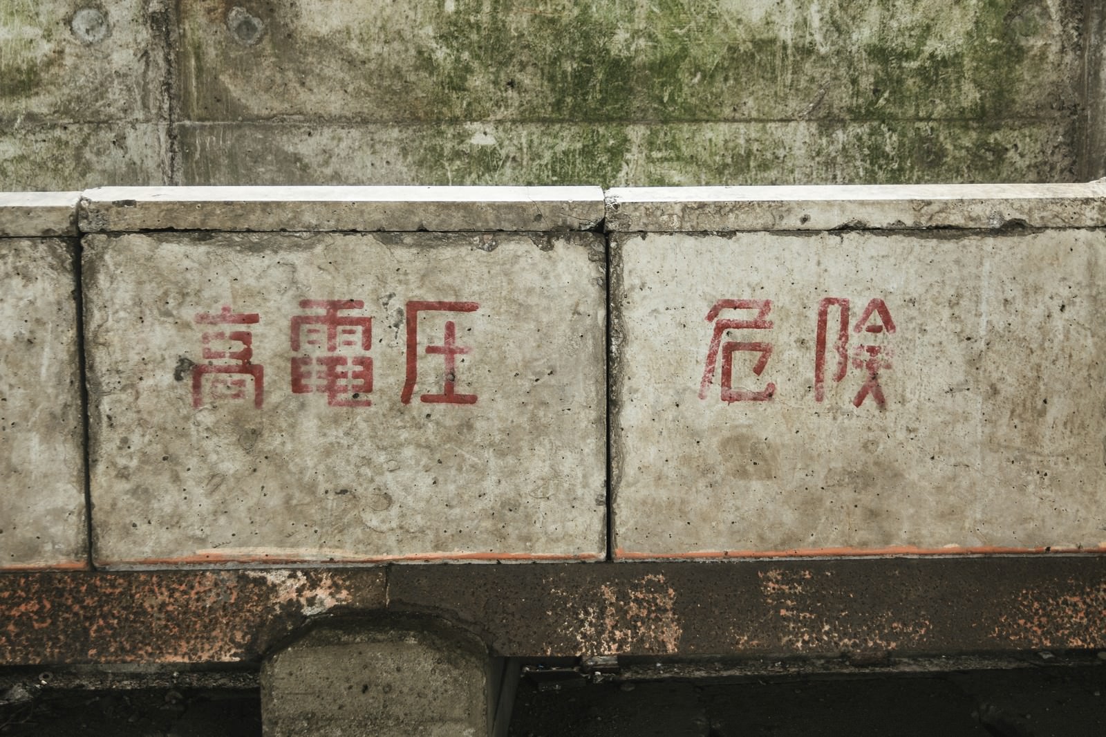高電圧危険の注意書きがあるコンクリート壁の写真素材です。経年劣化した古いコンクリート表面に赤い文字で「危険 高電圧」と書かれた警告表示が施されており、風雨による色褪せやひび割れが見られます。工業地帯や廃墟テーマのWebサイト、ブログ記事、危険表示や注意喚起の素材としておすすめです。