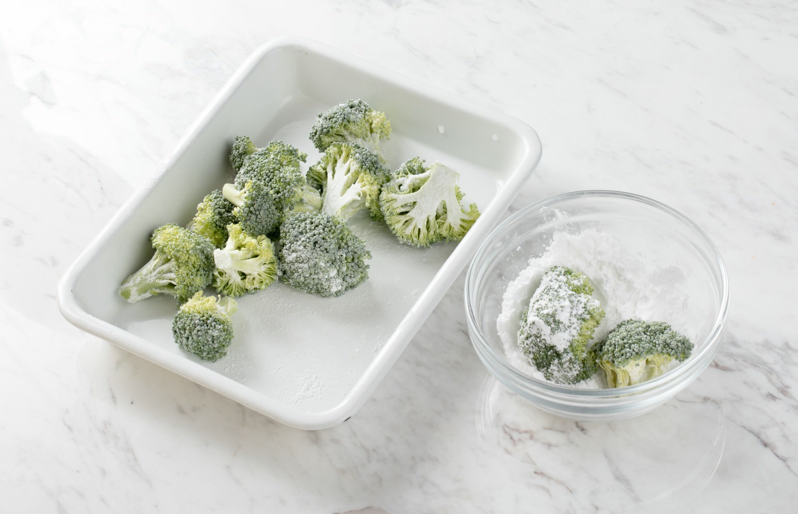 米粉をまぶしたブロッコリーの写真素材です。白い容器に入った緑のブロッコリーに米粉がコーティングされており、透明なボウルにも米粉が準備されています。グルテンフリー料理や食材の下準備を紹介するブログ、料理レシピサイトなどにおすすめです。