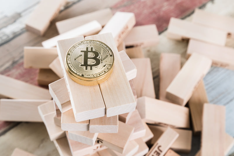 積み木の上に置かれたビットコインの写真素材です。木製の積み木ブロックが不安定に積み重なった上に金色のビットコインが配置され、バランスが崩れそうな危険な状態を表現しています。仮想通貨や投資リスク、金融の不安定性に関する記事やプレゼンテーション資料などにおすすめです。