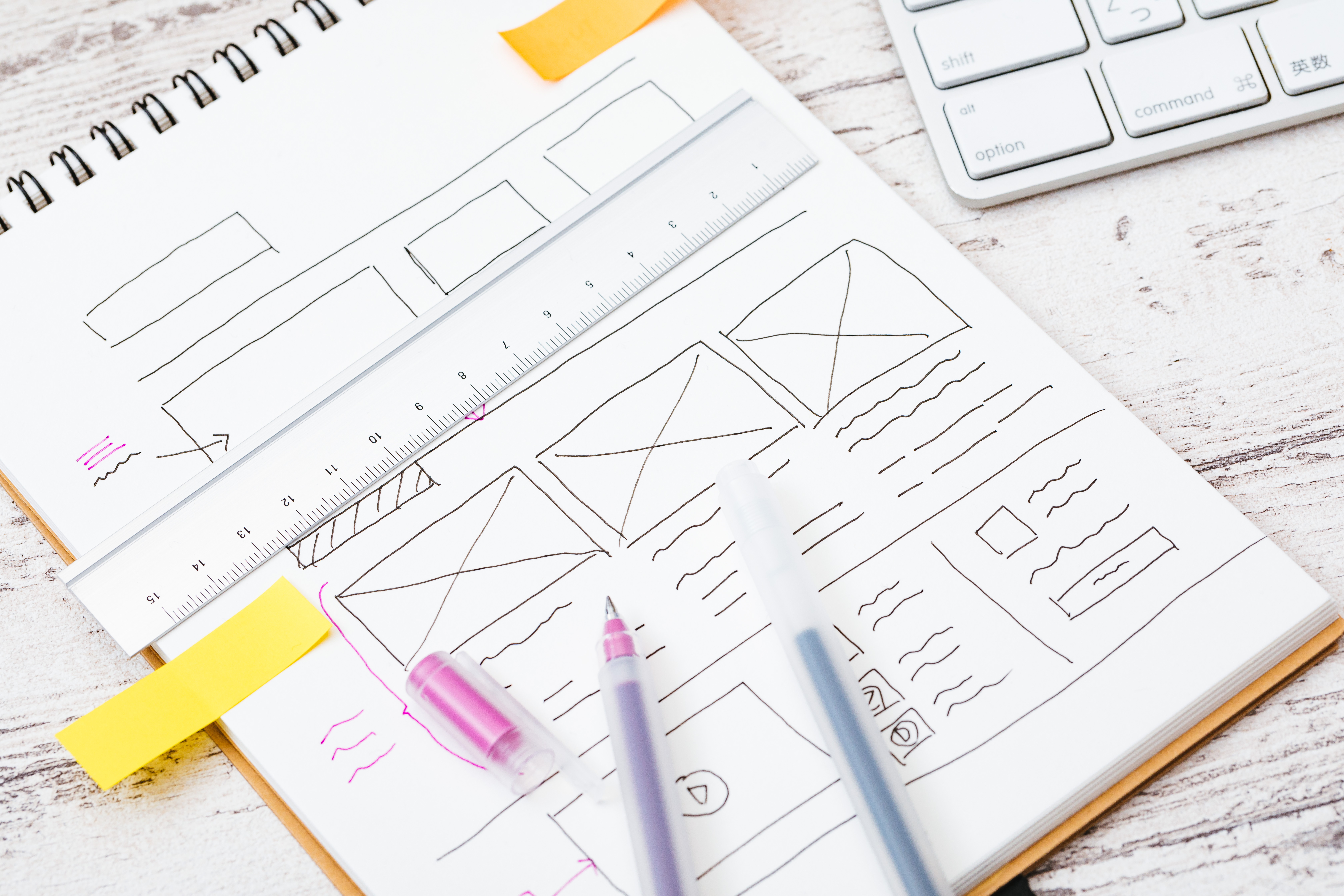 Webデザインのワイヤーフレームの写真素材です。作業デスクに広げられたノートの上で、ディレクターやデザイナーが手書きで設計図やラフ画、ワイヤーフレームを描きながら打ち合わせしています。Web制作やデザイン会議、企画書作成などにおすすめです。