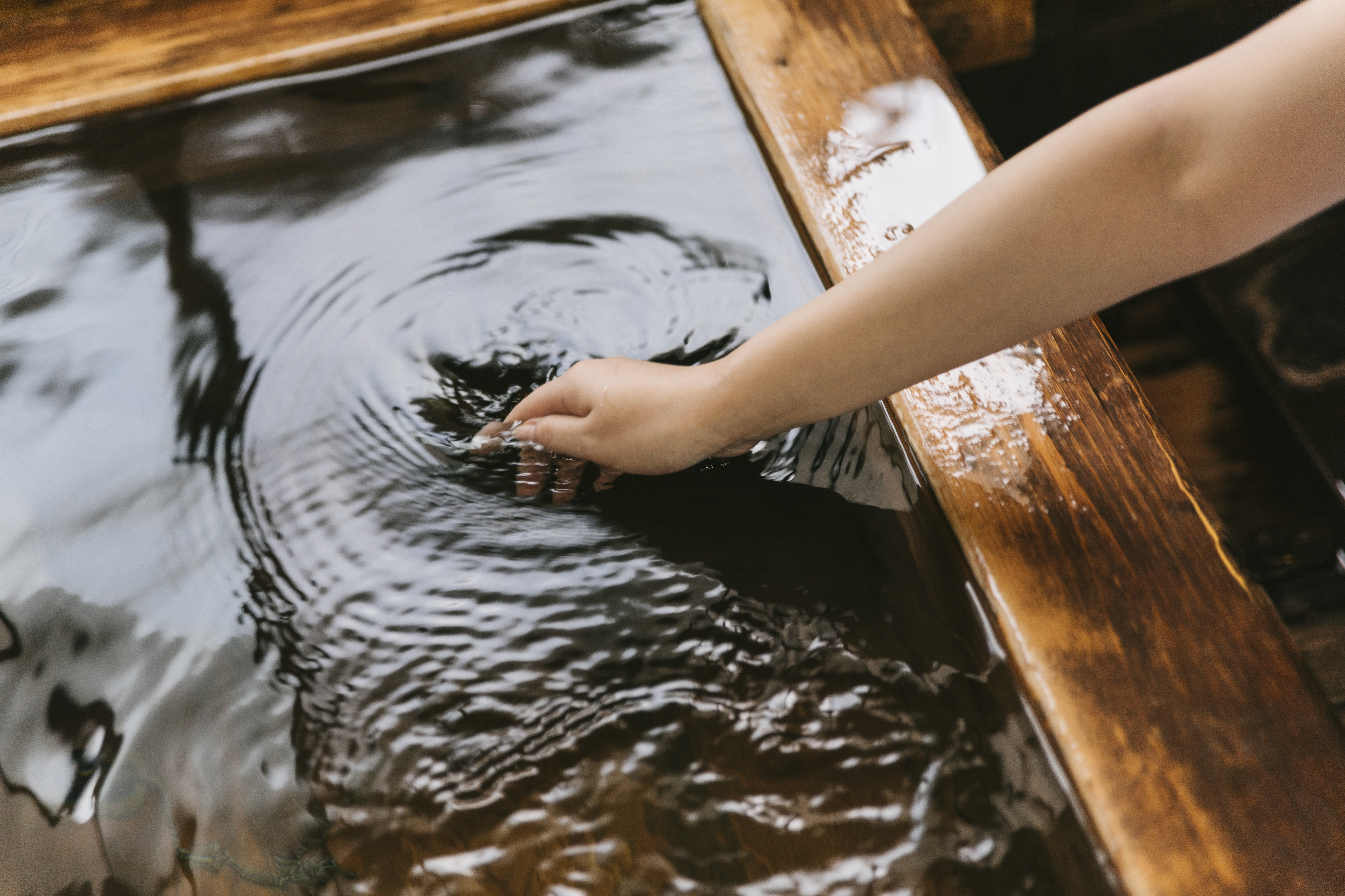 檜風呂の湯の写真素材です。木製の浴槽に透明な温泉が満たされ、檜の自然な木目と湯の表面の波紋が見え、源泉かけ流しから湯気が立ち上っています。温泉宿や旅館のWebサイト、リラクゼーション関連のブログ記事などにおすすめです。