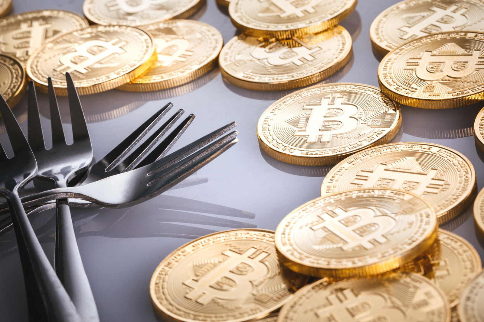 ビットコインの金貨とフォークが並んで置かれている写真素材です。金色のコインには仮想通貨のシンボルが刻印され、黒いフォークが添えられており、ハードフォークという暗号資産の分岐現象を視覚的に表現しています。暗号通貨やブロックチェーン関連の記事、仮想通貨の解説資料などにおすすめです。