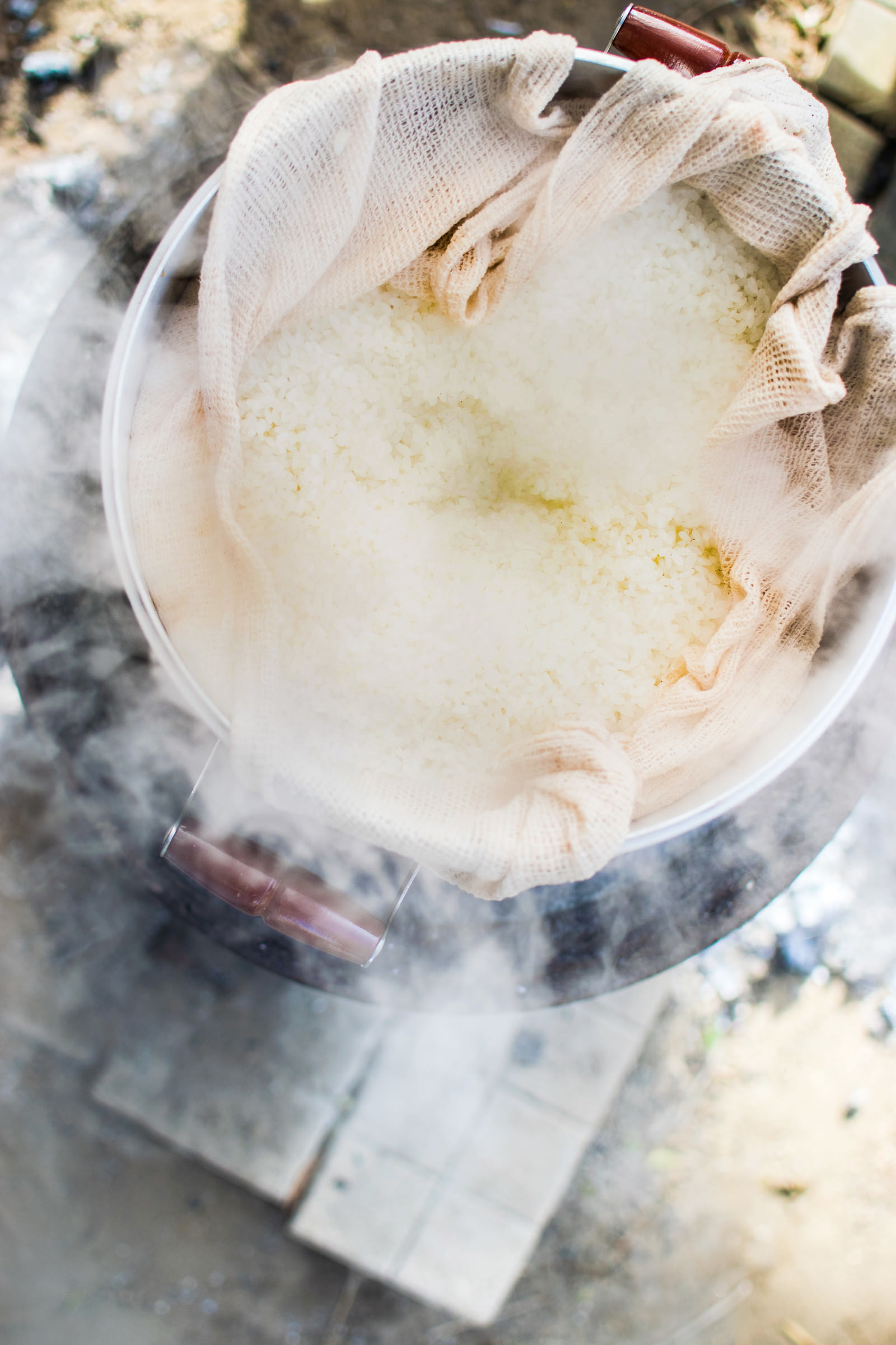 釜戸で蒸したホカホカのもち米の写真素材です。白いもち米から立ち上る湯気が温かさを示し、釜戸を使った伝統的な蒸す調理方法を記録した一枚。かまどの炎で加熱され、じっくり蒸されたもち米の食材としての活用シーンや、和食・伝統料理の紹介、調理工程の説明などにおすすめです。