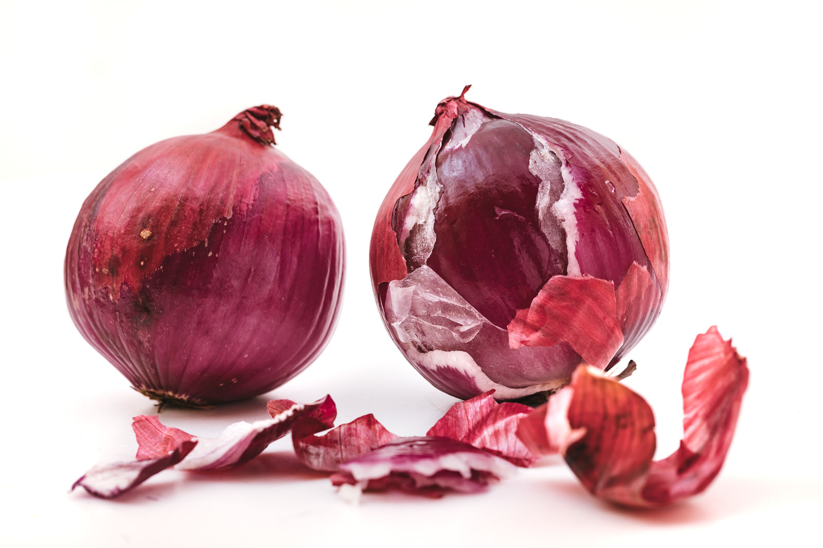 皮を剥いたレッドオニオンの写真素材です。赤紫色の玉葱が半分にカットされ、周囲には剥がれた薄い表皮が散らばっており、断面の瑞々しさと新鮮な質感が伝わります。料理レシピや食材紹介、健康情報などの制作におすすめです。