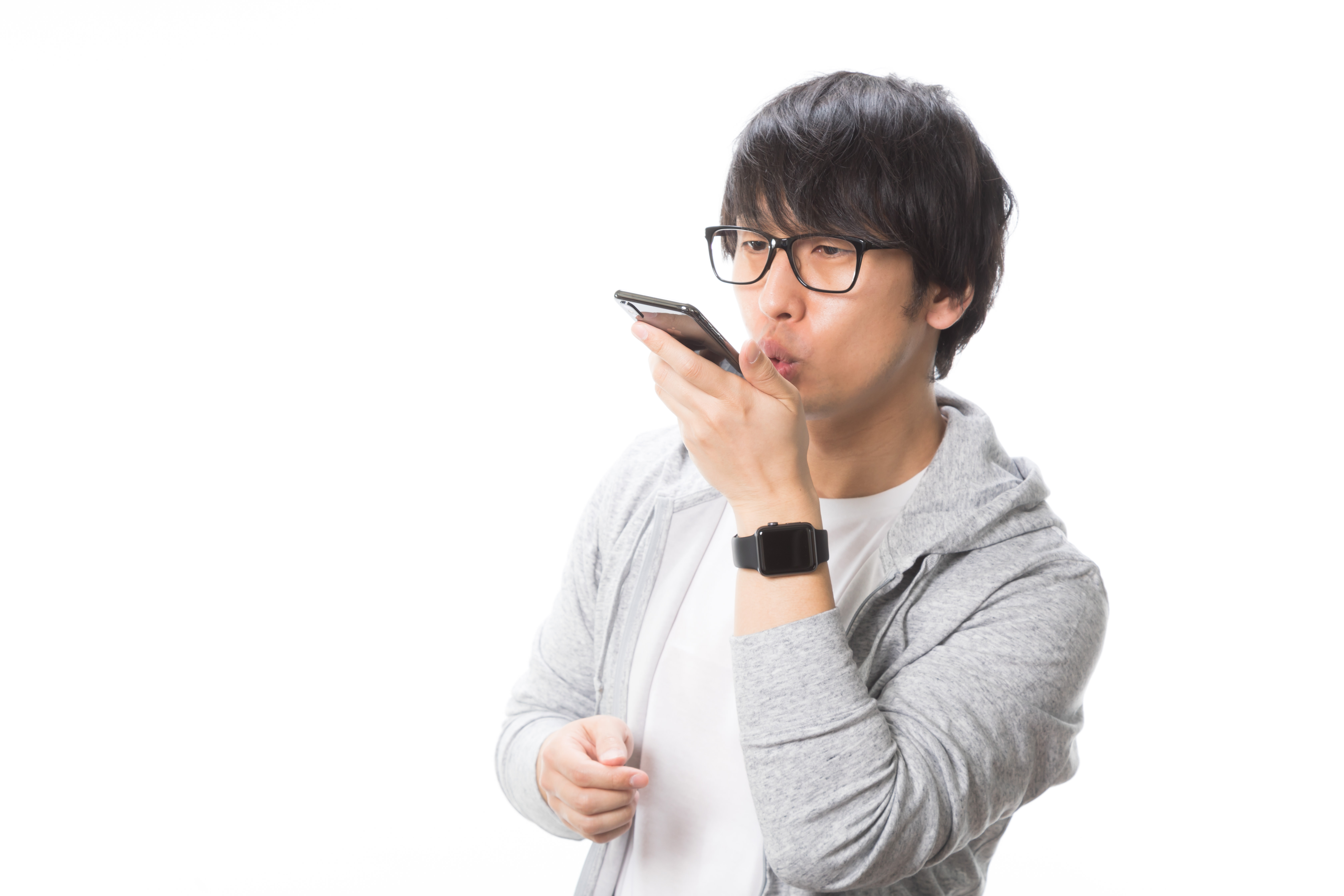 スマートフォンにSiriで話しかける男性の写真素材です。メガネをかけた男性が口をすぼめて、スマホを口元に近づけています。音声入力やボイスチャット、スマートフォン関連の記事などにおすすめです。
