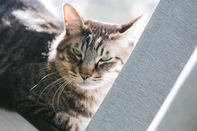 不機嫌そうな表情の猫の写真素材です。キジトラの猫が目を細めて睨むような表情を見せており、耳も後ろに倒れている怒った状態が捉えられています。ペット関連のWebサイトやブログ、猫の感情表現を必要とするコンテンツに最適です。