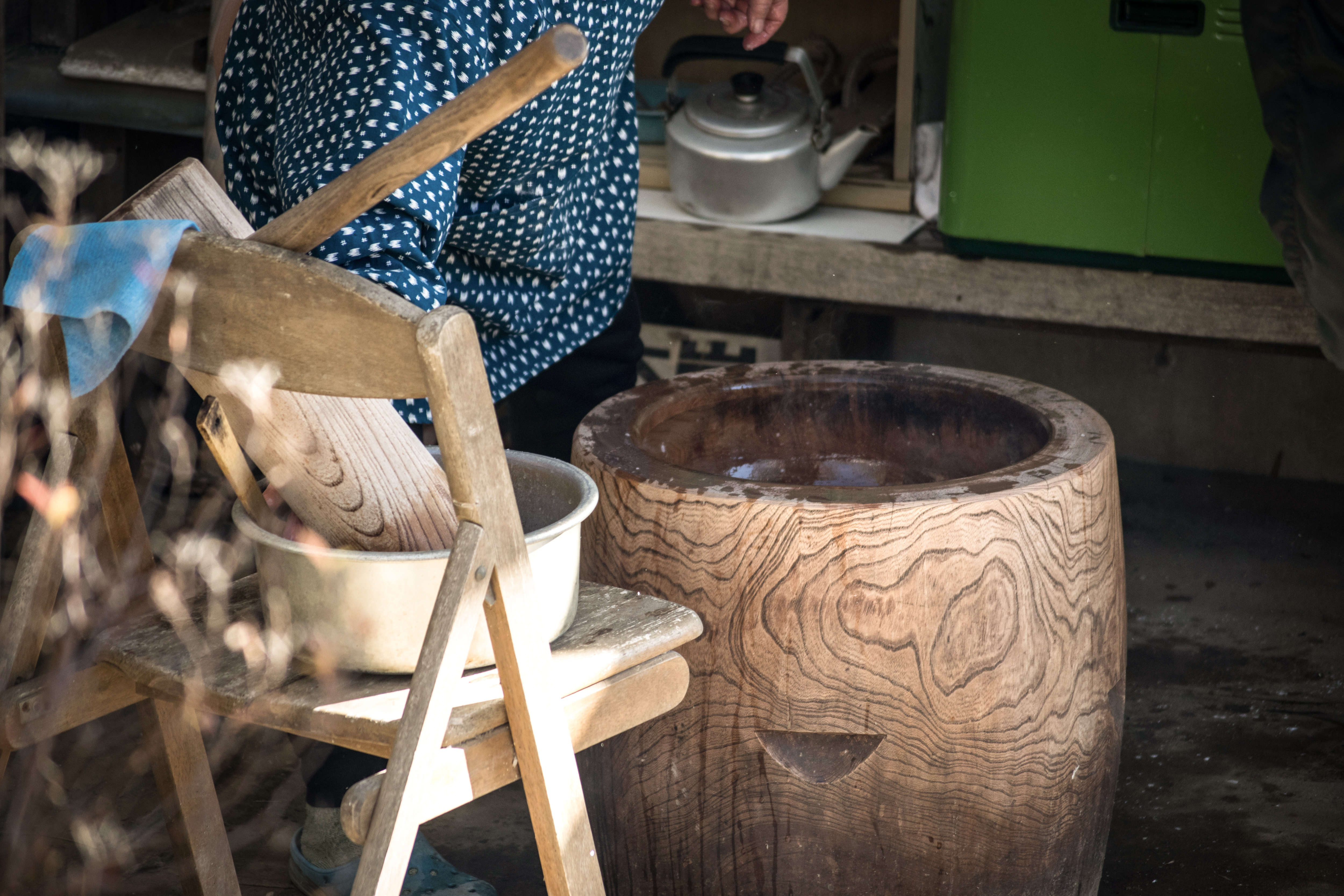 田舎のお正月準備の写真素材です。木製の臼と杵が置かれており、背景には薪や調理器具が見えます。昔ながらの伝統的な餅つきの準備風景を撮影したもので、お正月や年末年始のコンテンツ制作、日本の伝統文化を表現する記事などにおすすめです。