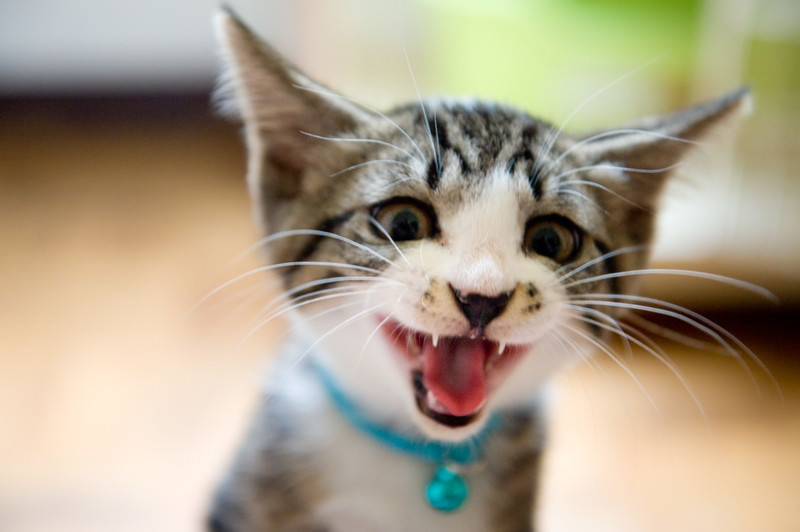 室内で口を大きく開けて鳴く、キジトラ縞模様の子猫の写真素材です。青い首輪に鈴が付いていて、ピンクの舌と白いひげが見える。ペット関連コンテンツやSNS投稿などにおすすめです。