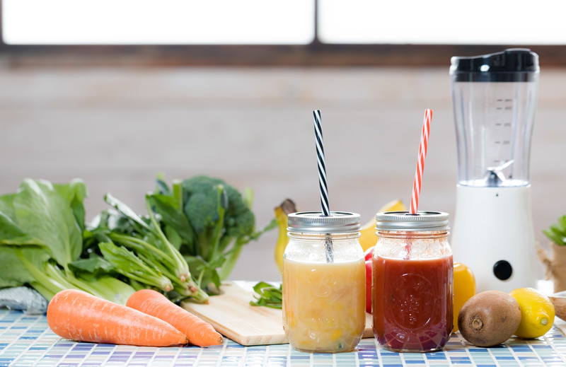 葉物野菜とフルーツで作ったスムージーの写真素材です。人参とキウイ、レモンを使ったスムージーが入ったグラス2本にストローが挿さり、奥にはミキサーが置かれています。健康飲料やスムージーレシピ、朝食関連のWebサイトやブログ記事、栄養食に関するコンテンツなどにおすすめです。