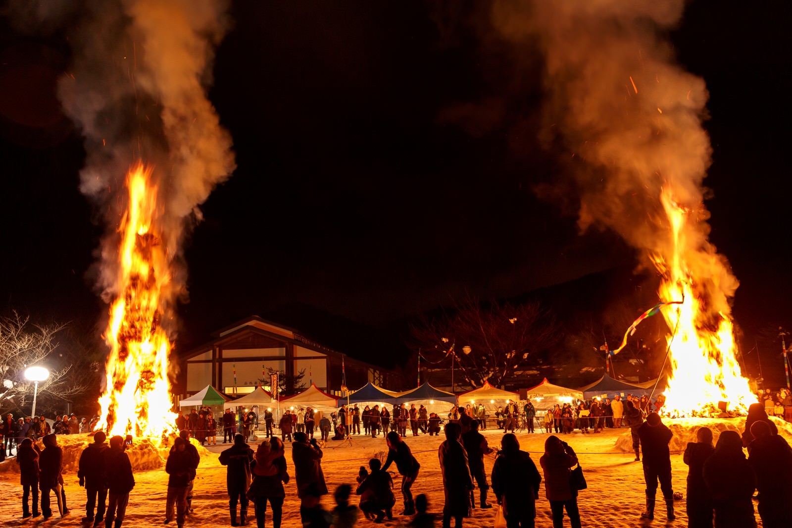 天筆焼きの写真素材です。夜空に向かって立つ2本の巨大な火柱が燃え上がり、その周りに集まる多くの人々のシルエットが暗い背景に浮かぶ光景を表現しています。冬の伝統行事の迫力ある瞬間を記録した素材として、祭り関連の記事や歴史文化コンテンツの活用におすすめです。