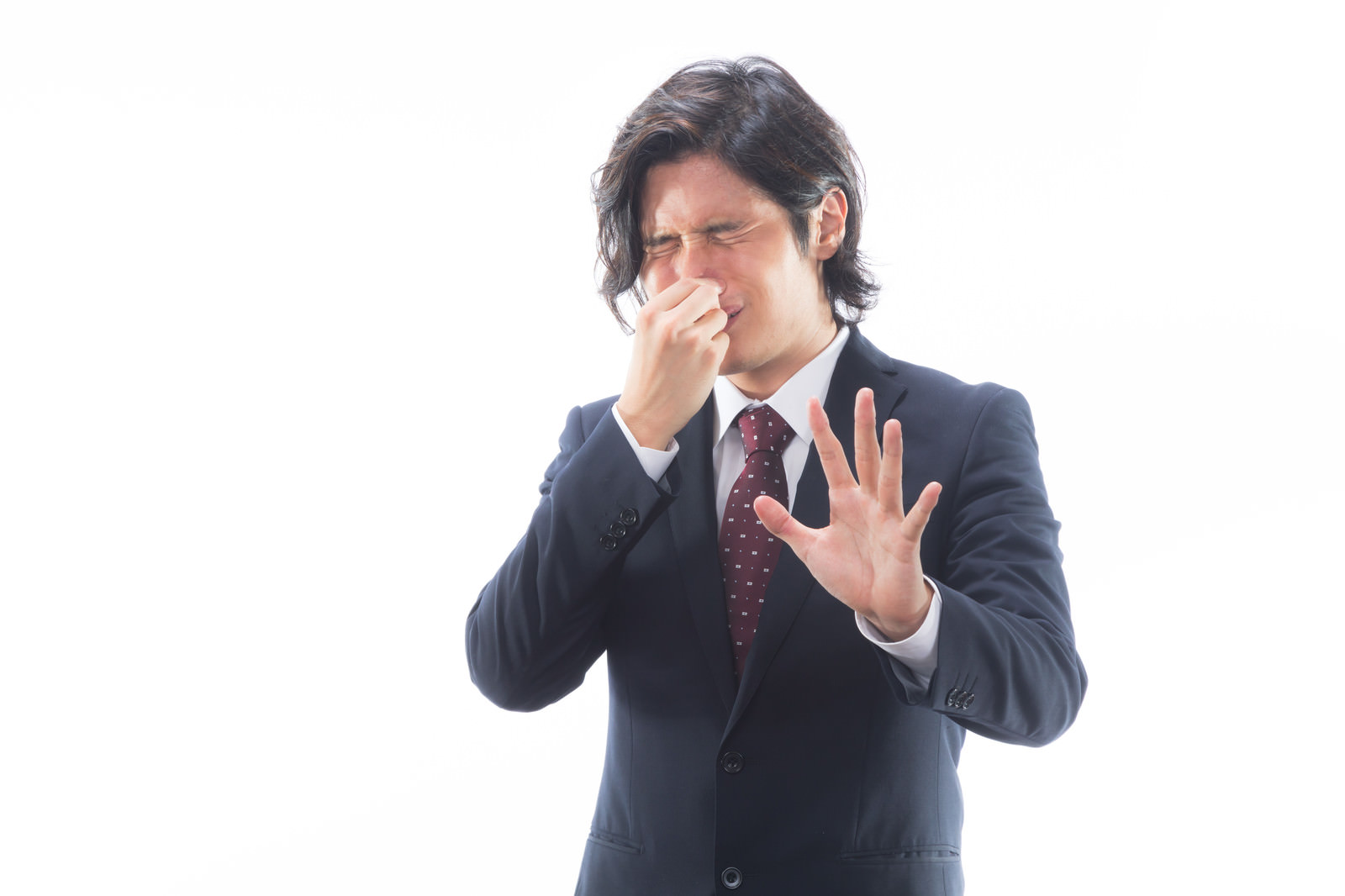強烈な体臭のにおいを浴びせられた飛び込み営業の写真素材です。紺色のスーツと葡萄色のドット柄ネクタイを着た男性が、片手で鼻をつまみ、もう片方の手で停止のポーズをとりながら、眉をひそめて不快感を示しています。営業拒否やビジネストラブルなどにおすすめです。