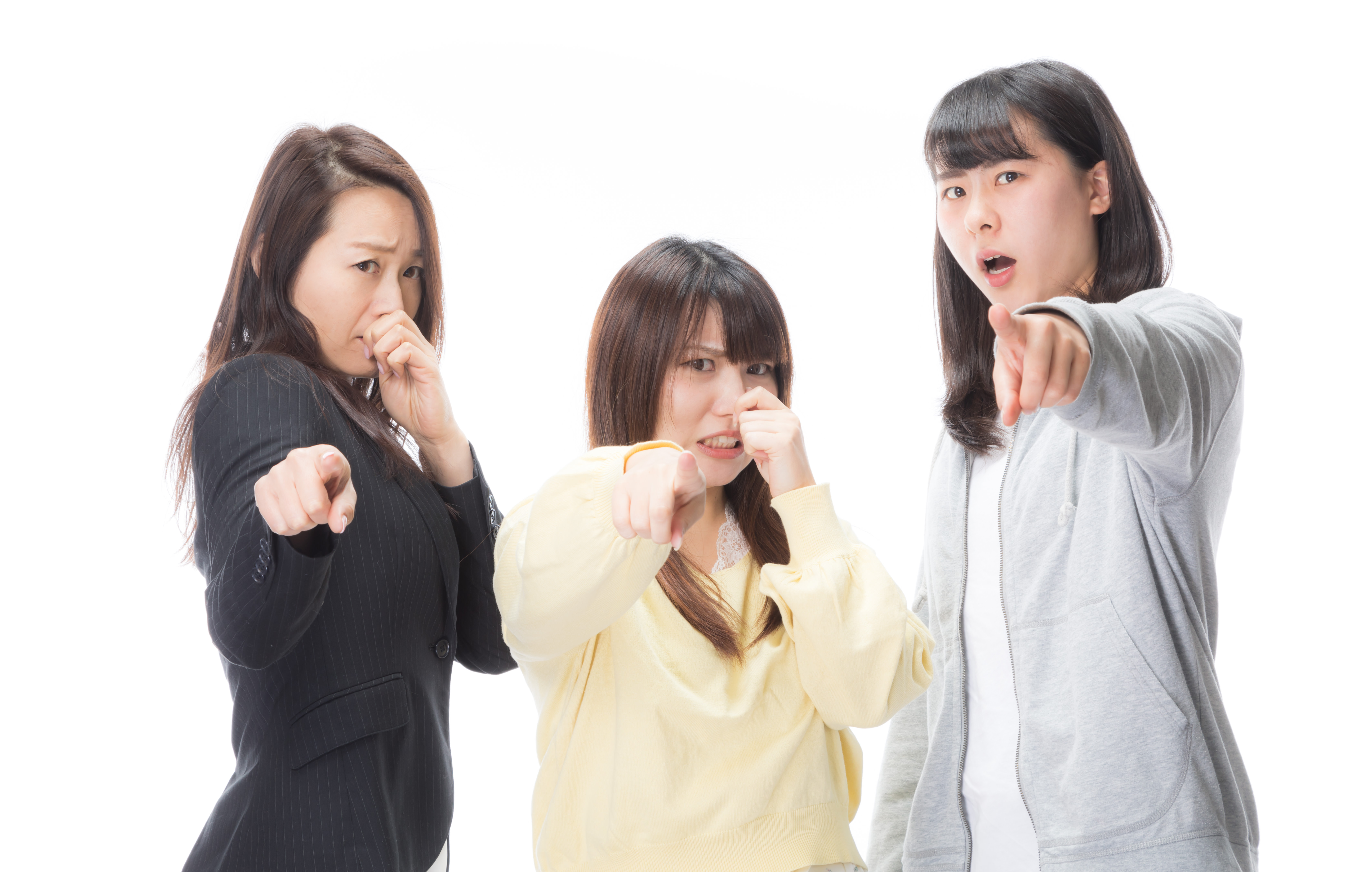 におい問題に困っている女性たちの写真素材です。三人の女性が鼻をつまんだり指差しをしたりして、体臭やくさいにおいの原因を指摘する様子が撮影されています。デオドラント商品の広告やにおい対策に関するWebサイト、ブログ記事などにおすすめです。