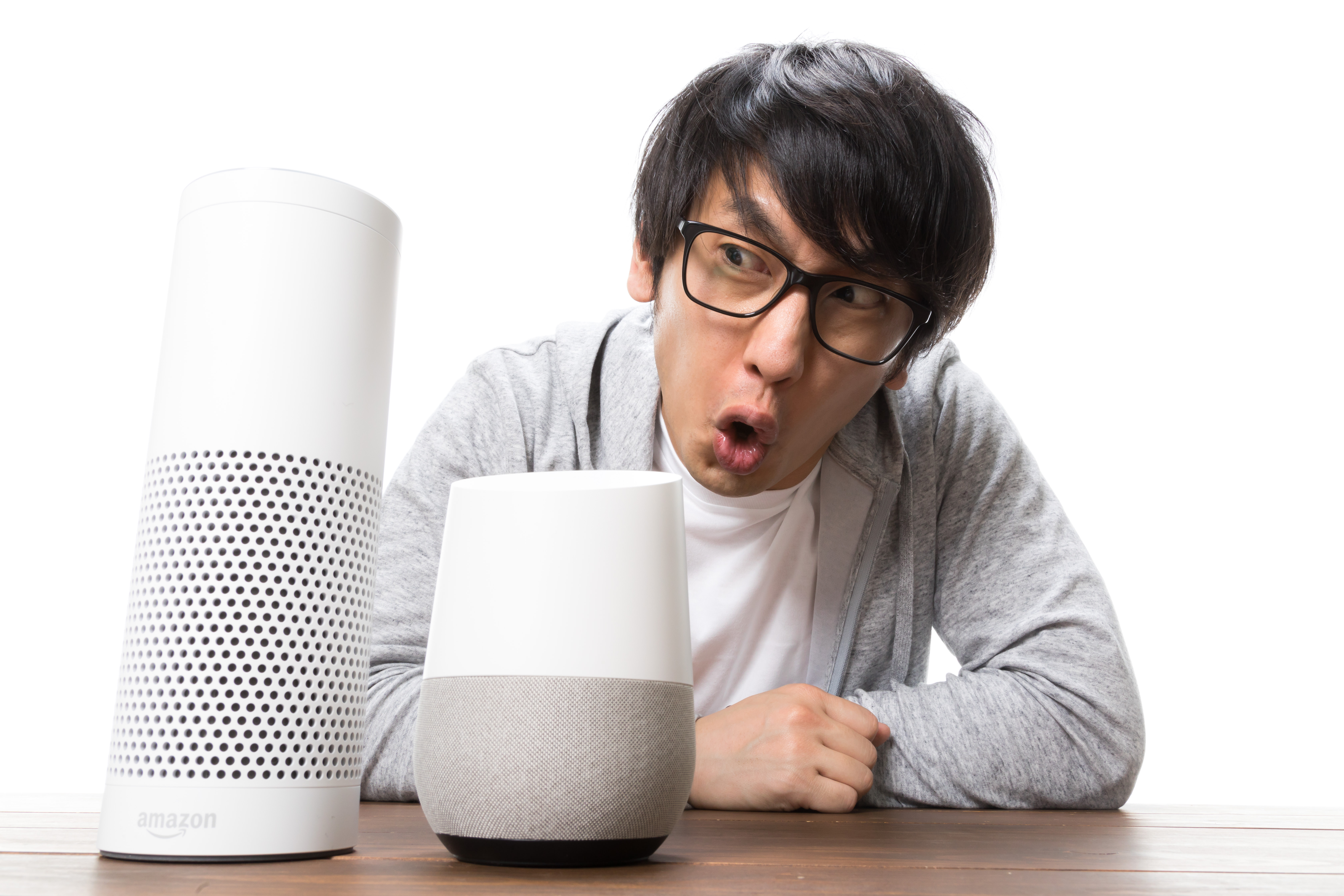 スマートスピーカーに向かって怒鳴る男性の写真素材です。眼鏡をかけた男性がデスクに置かれた白いスマートスピーカーに対して大きく口を開けて叫んでいる様子が写されています。音声認識の失敗やAIアシスタントとのやり取りを表現するコンテンツ、IT関連の記事やブログなどにおすすめです。