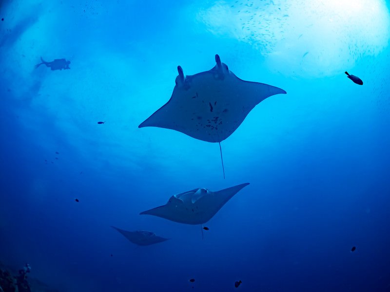 青い海中を泳ぐマンタの魚群の写真素材です。深い青色の海の中で複数のマンタが並んで泳ぎ、胸びれを優雅に動かしながら集団で移動する様子をとらえています。スキューバダイビング中に実際に遭遇できる海洋生物の一シーンで、海洋生物の図鑑やダイビング関連の記事、海の生き物に関する教育コンテンツなどにおすすめです。