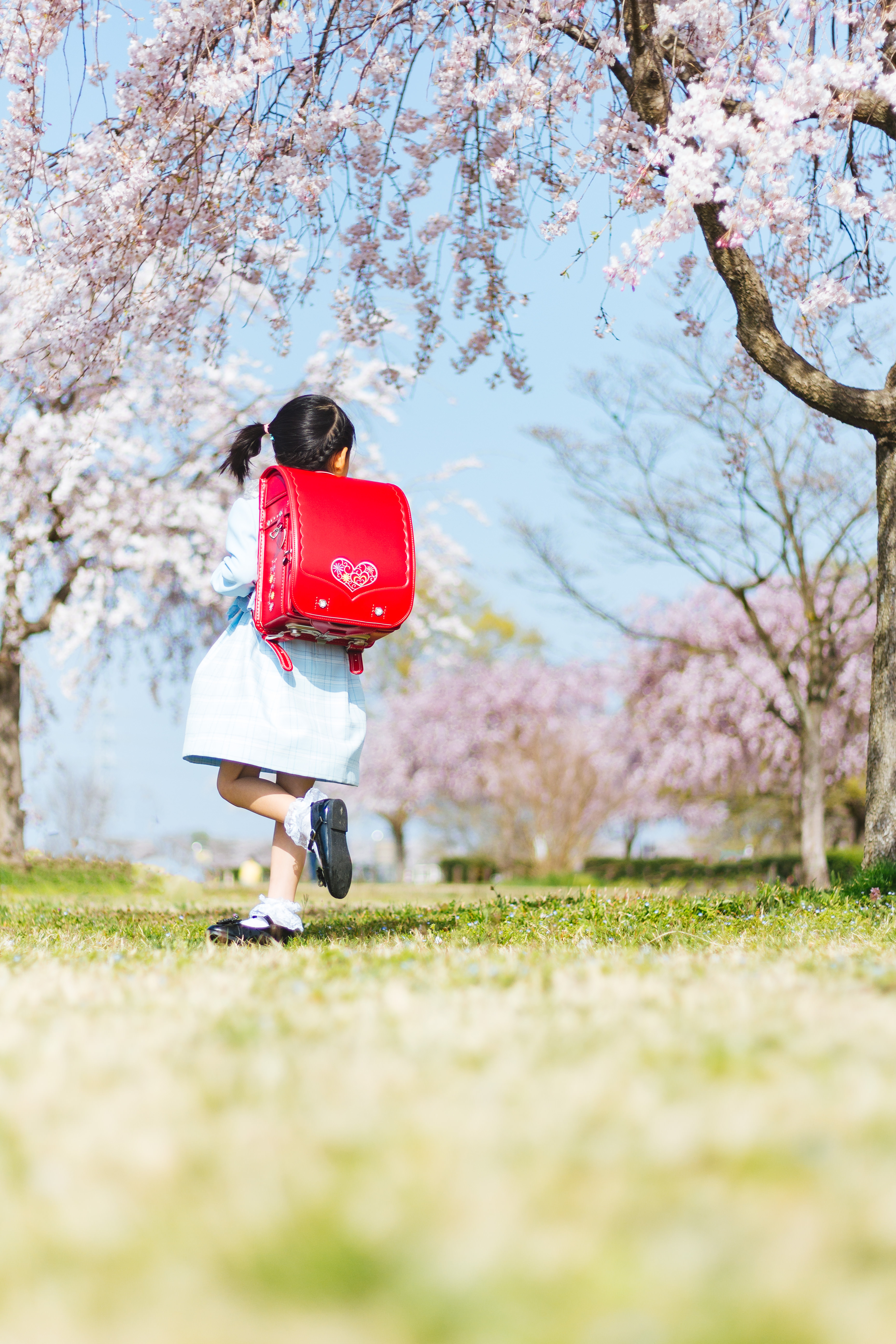 ランドセルを背負った一年生の写真素材です。赤いランドセルを背負った女の子が桜の木の下でスキップしている後ろ姿で、春の新入生らしい明るく楽しい雰囲気を演出しており、入学式や春の学校生活、教育関連のコンテンツ制作におすすめです。