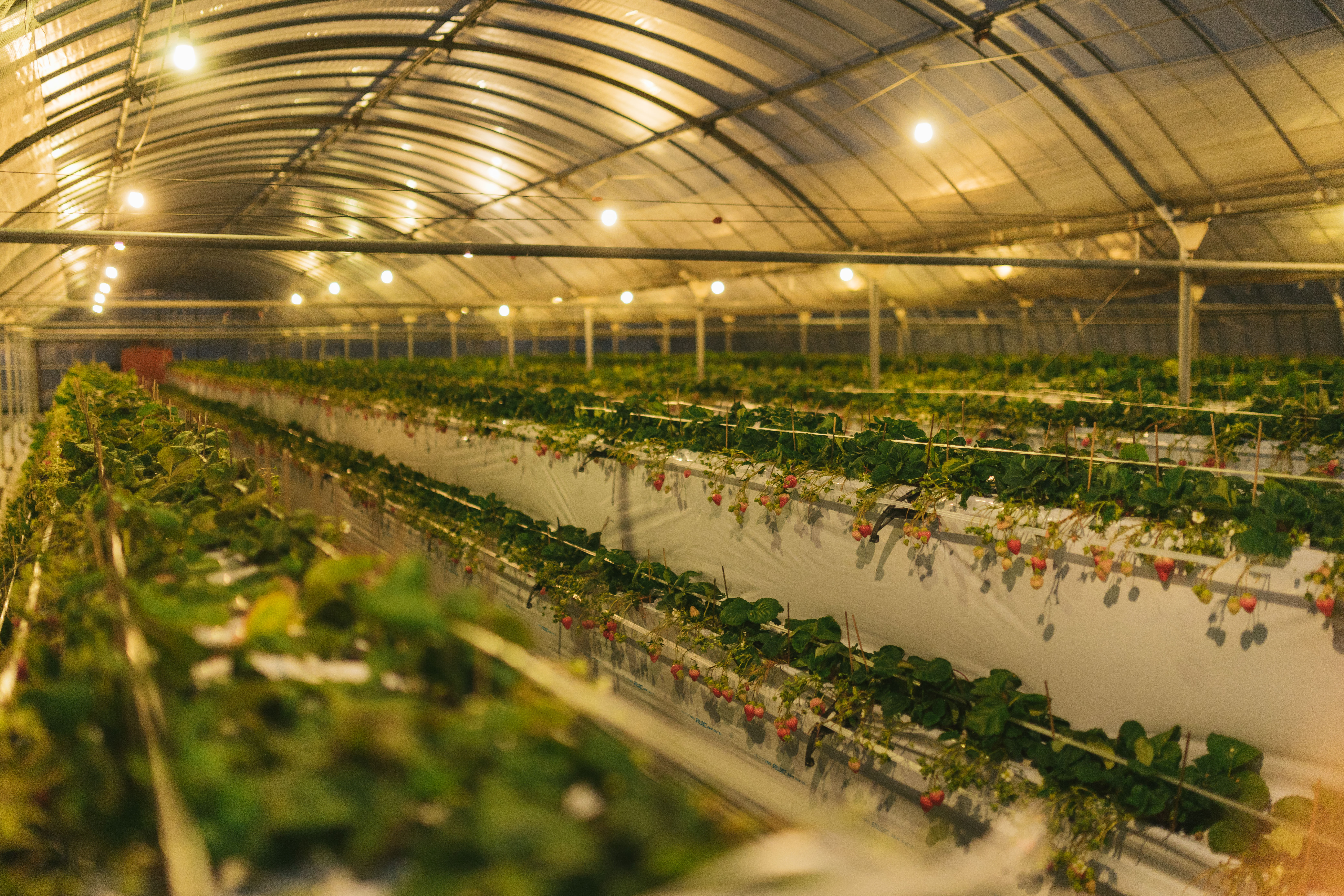 ハウス内でライトアップされたいちご栽培の写真素材です。赤い実をつけたいちごが整然と並んだ栽培ベッドに育ち、緑の葉に温かな照明が当たるハウス内の夜間栽培風景が広がっています。いちご狩り紹介や農業コンテンツ、地域の特産品PR等におすすめです。