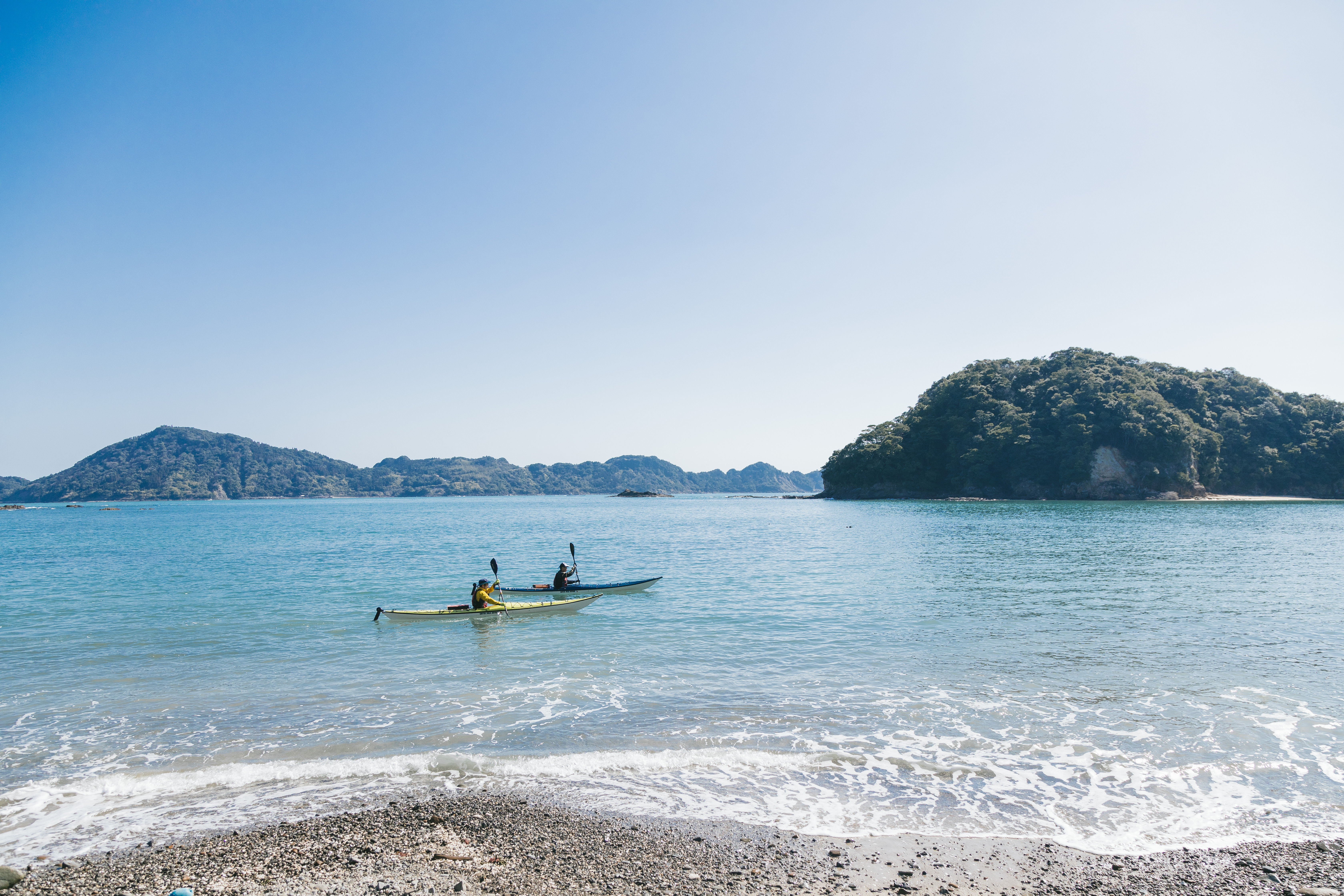 栄松ビーチでシーカヤックを楽しむ2人の写真素材です。青い海に黄色いカヤックが浮かび、2人が乗って海上を進み、穏やかな海面と青空が広がっています。マリンスポーツやアウトドア体験を紹介するWebサイト、観光PR、レジャー関連のブログなどにおすすめです。