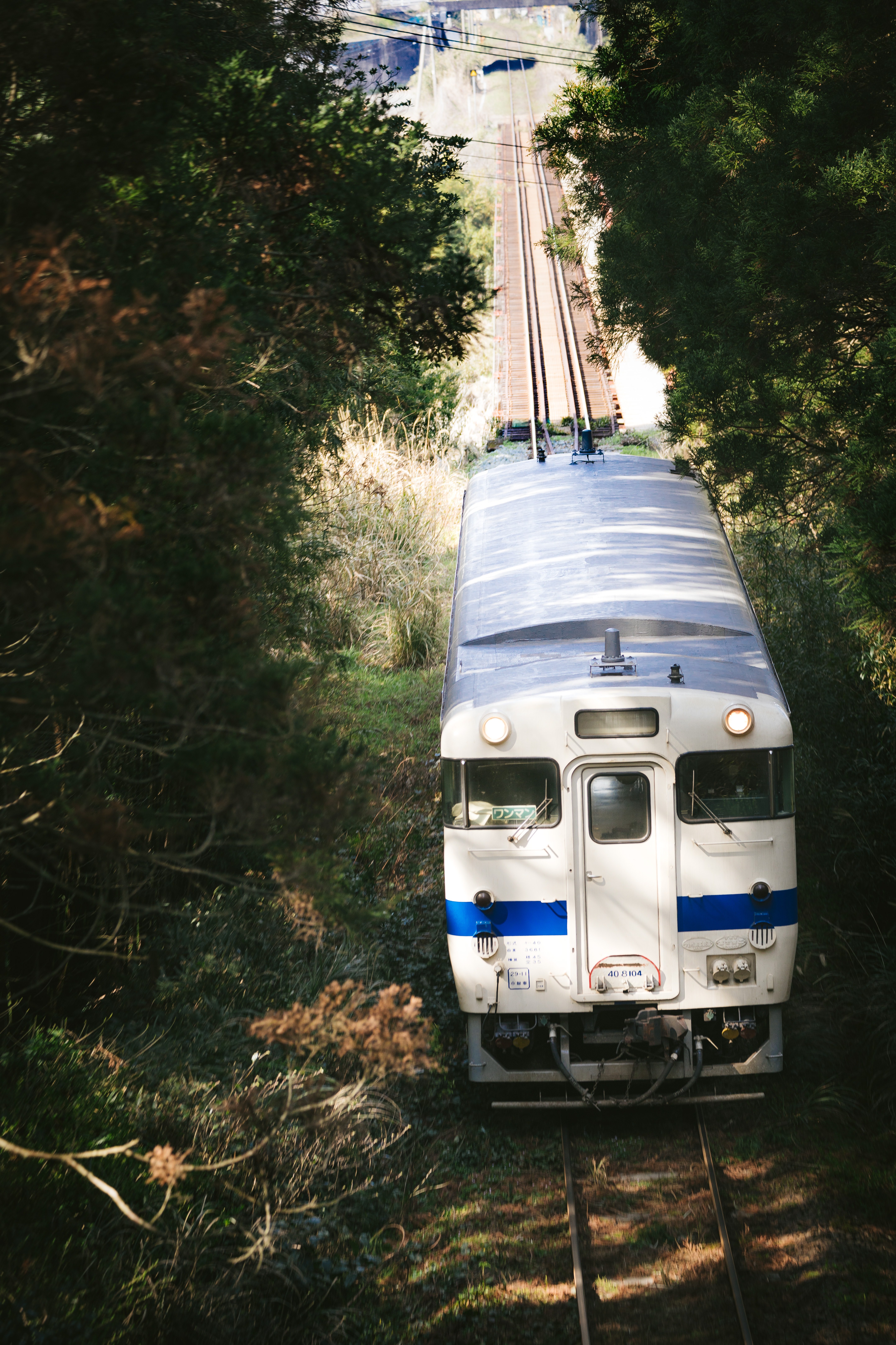 線路を走る日南線の写真素材です。緑豊かな樹木に囲まれた線路上を、小枝をかすめるようにして白い車両が進んでいます。宮崎県ののどかなローカル線の風景が広がる乗車風景で、観光サイトやブログ、鉄道関連のデザイン素材などにおすすめです。