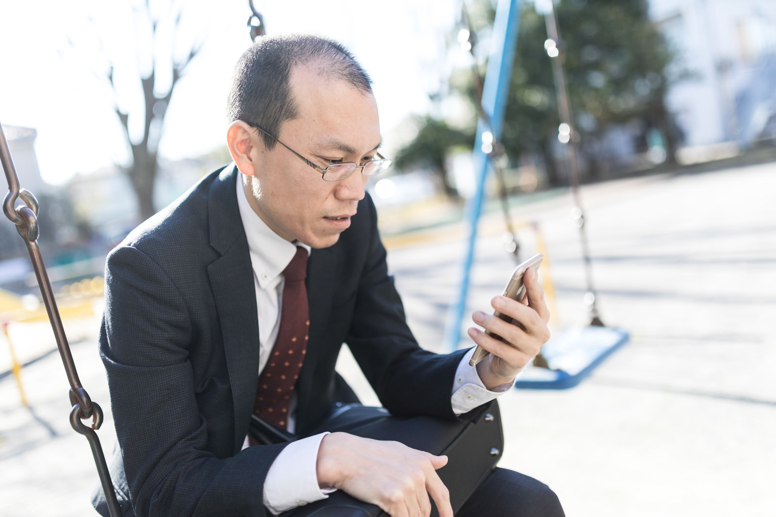 ブランコに座りスマートフォンを見る薄毛の会社員男性の写真素材です。スーツを着た男性が公園のブランコで携帯電話の画面を見つめ、娘からのメッセージを確認しています。育毛や薄毛対策のWebサイト、働く男性向けのブログ、仕事と家庭のテーマなどにおすすめです。