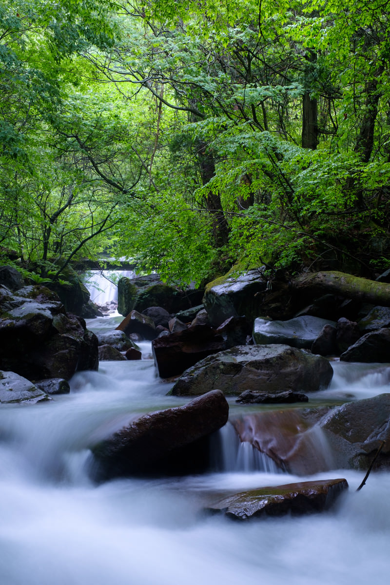 信州蓼科の秘境・横谷渓谷の写真素材です。渋川の上流で、緑豊かな森に囲まれた岩場を流れる渓流を長時間露光で撮影し、水の流れが絹のようなきめ細かさに表現されています。自然景観の背景素材や長野県の観光関連コンテンツ、渓谷の風景表現に最適です。