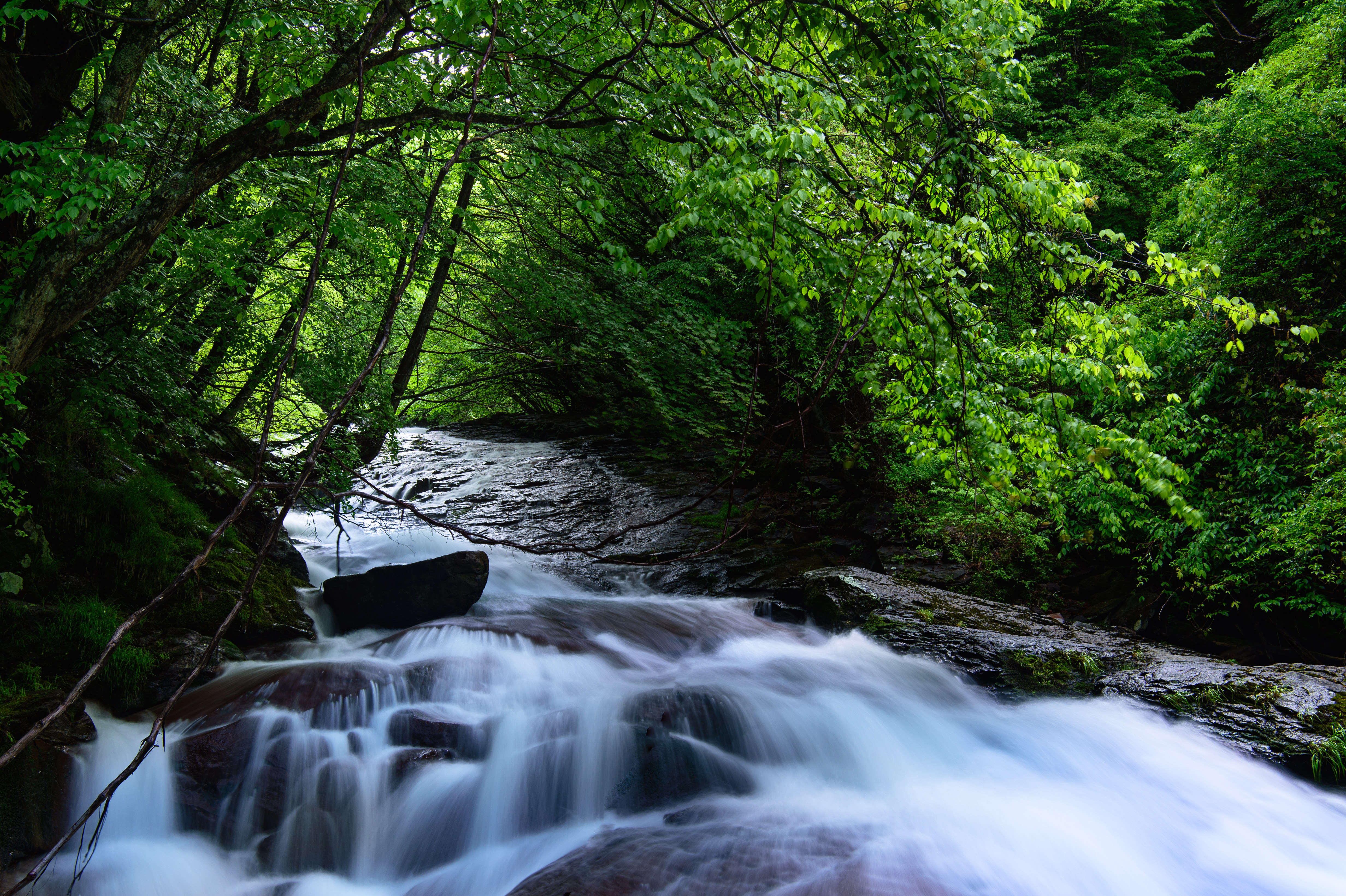 横谷渓谷に流れる渋川の写真素材です。緑豊かな森に囲まれた上流部の渓流が大きな岩の間を勢いよく流れ、白い水しぶきを上げています。長野県の自然が織りなす美しい渓谷風景で、アウトドアや自然関連のコンテンツに最適な素材です。