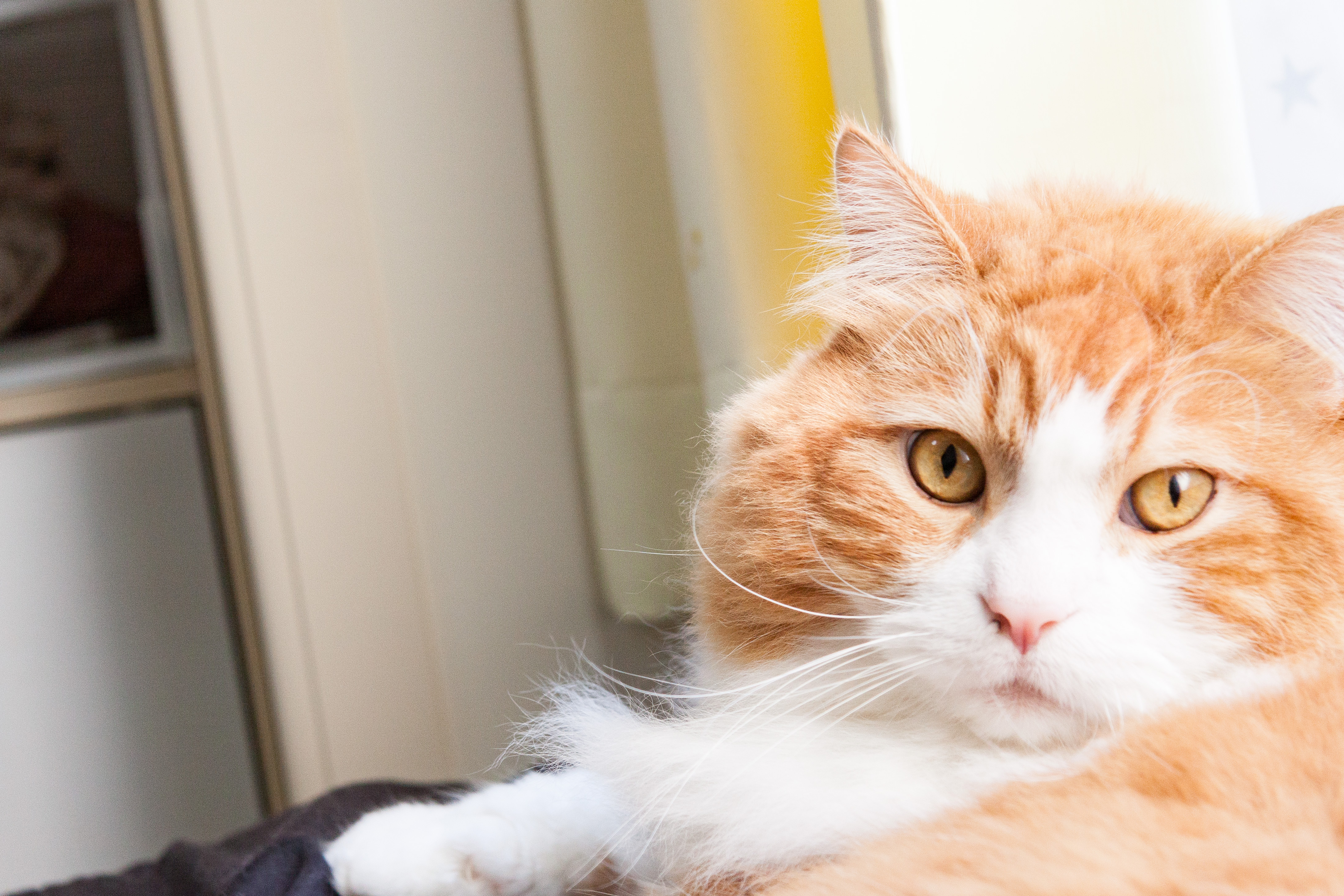 いたずらがバレて振り返る猫の写真素材です。茶白の猫が驚いたような表情でこちらを振り返り、目を丸くして何かに気づいた様子が写っており、びっくりした瞬間の猫らしい仕草が表現されています。ペット関連のコンテンツや動物の表情を活かしたデザイン、SNS投稿などにおすすめです。