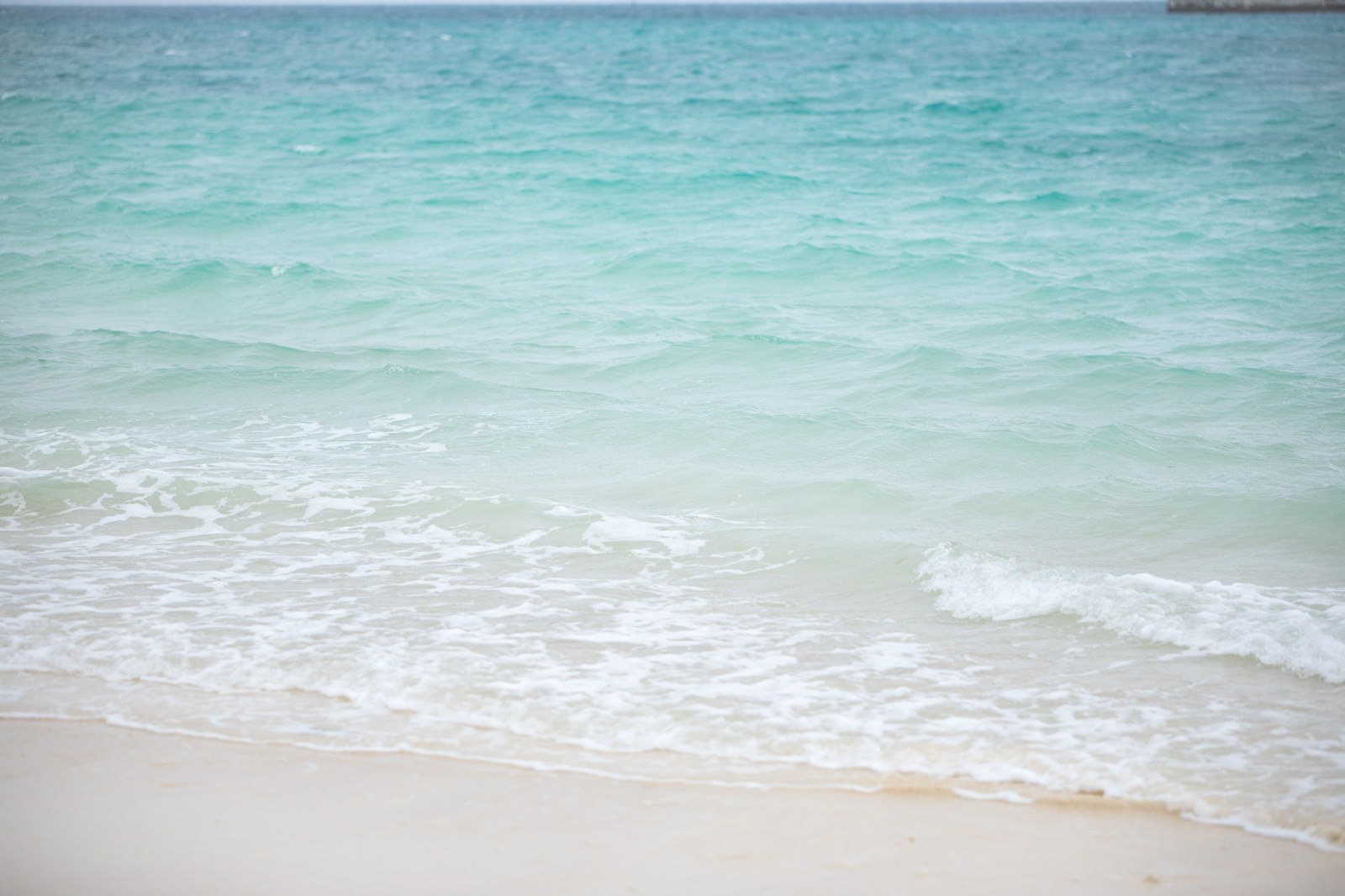 宮古島のビーチを撮影した写真素材です。曇り空の下、小さな波が打ち寄せる波打ち際と水平線が広がります。旅行・観光・リゾート関連のウェブサイトやパンフレットにおすすめです。
