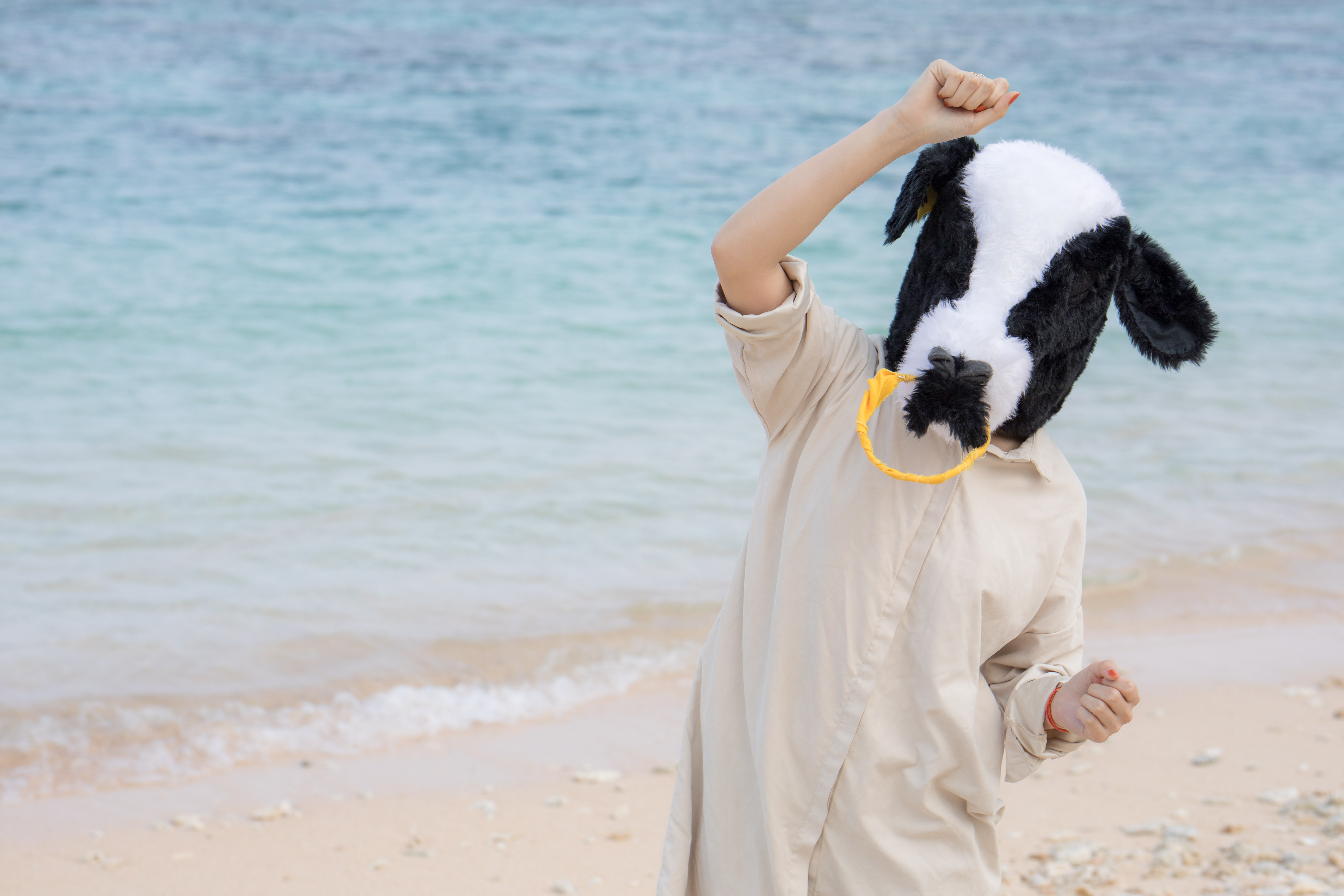 南の島のビーチで踊る牛ガールの写真素材です。白いワンピースを着た牛女が黒い牛柄の髪飾りを付け、青い海と砂浜を背景に両手を上げて元気に踊る姿を捉えています。リゾート旅行やバカンスの広告、夏のキャンペーン制作などにおすすめです。