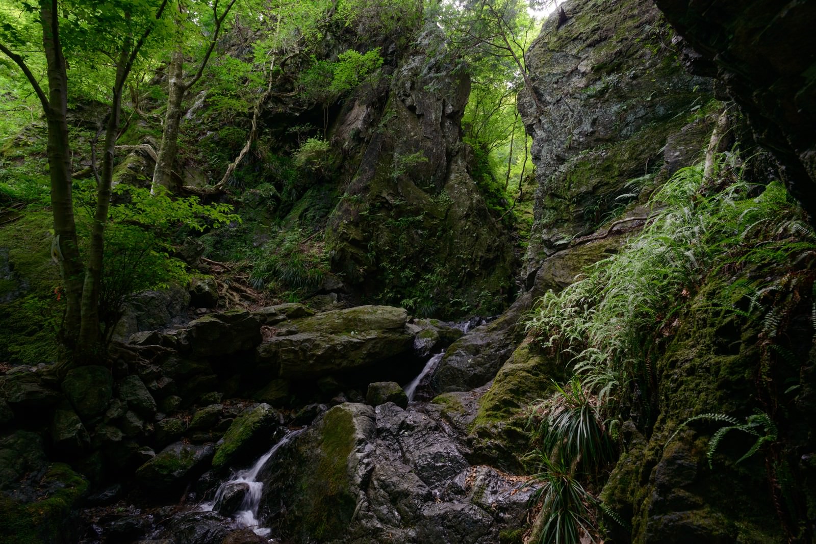 棒ノ嶺の牢門にある渓谷を流れる小川の写真素材です。苔むした岩やシダ植物が茂る薄暗い森の中を水が流れ落ちている。登山や渓谷の景観写真、自然風景素材としておすすめです。
