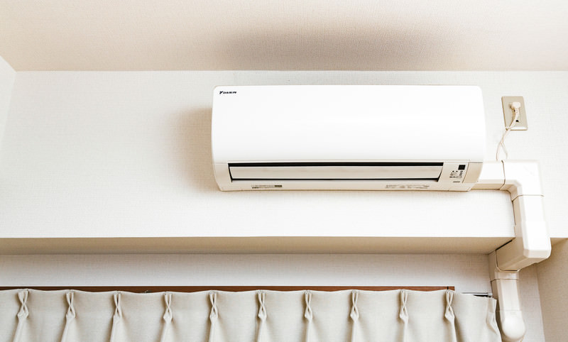 ワンルームの壁に取り付けられたダイキン製エアコンの写真素材です。白い壁とカーテンレールの上部に室内機が収まり、配管カバーが右側に伸びています。熱中症対策や夏の冷房をテーマにした記事・コンテンツにおすすめです。