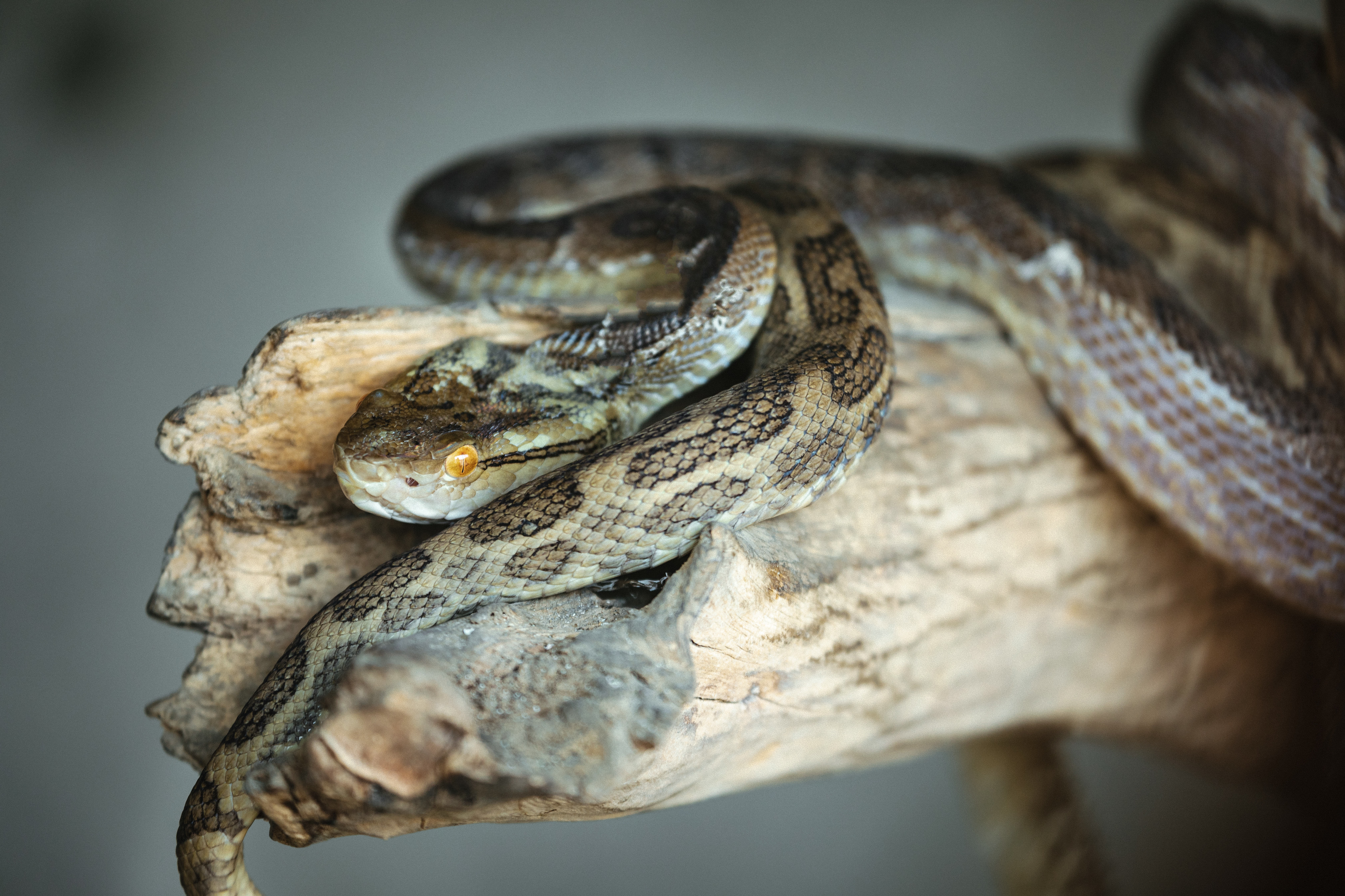 徳之島で捕らえられたハブの写真素材です。木材の上に横たわるハブで、体全体に茶色い鱗模様があり、頭部と胴体がはっきり確認できます。南西諸島に生息する猛毒のハブは、鹿児島県の危険生物として知られており、危険生物の学習資料や自然環境に関する記事、爬虫類の教育コンテンツなどにおすすめです。