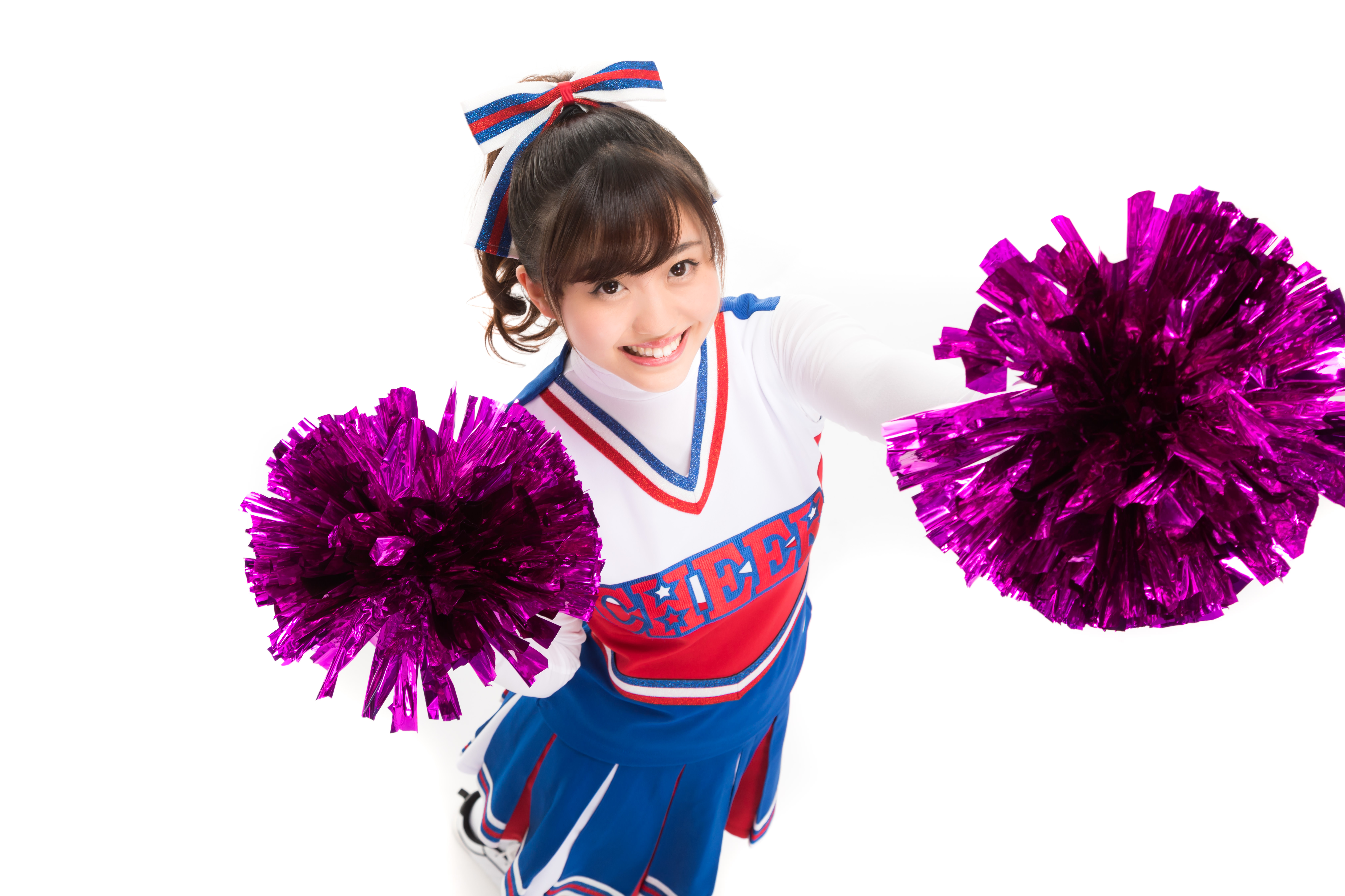 紫色のポンポンを振るチアガールの写真素材です。赤と青のユニフォームを着用した女性が両手にポンポンを持ち、元気よくポーズを取っています。スポーツイベント、チーム応援、運動会関連のWebサイト制作やブログなどにおすすめです。