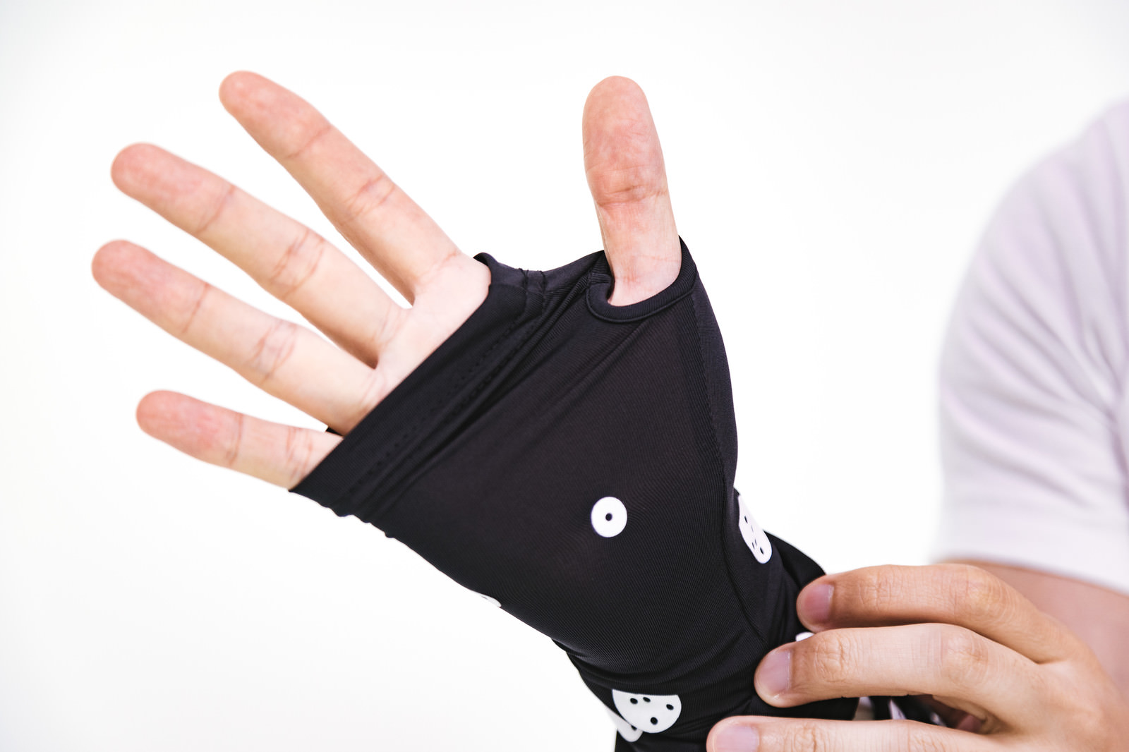 採寸ボディースーツ ZOZOSUIT の袖口の写真素材です。黒い手袋状の袖部分が手のひらをぴったり覆い、白いボタンが装着された採寸用グローブの計測状態を示しています。ファッション関連や採寸機器の紹介、通販サイトのコンテンツなどにおすすめです。